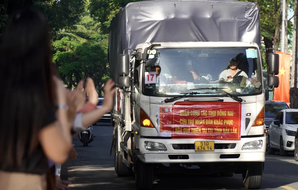 Đoàn xe chở hàng hóa, thuốc men và một số nhu yếu phẩm đường cứu trợ nhân dân tỉnh tỉnh Đắk Lắk khắc phục hậu quả thiên tai bão lũ.