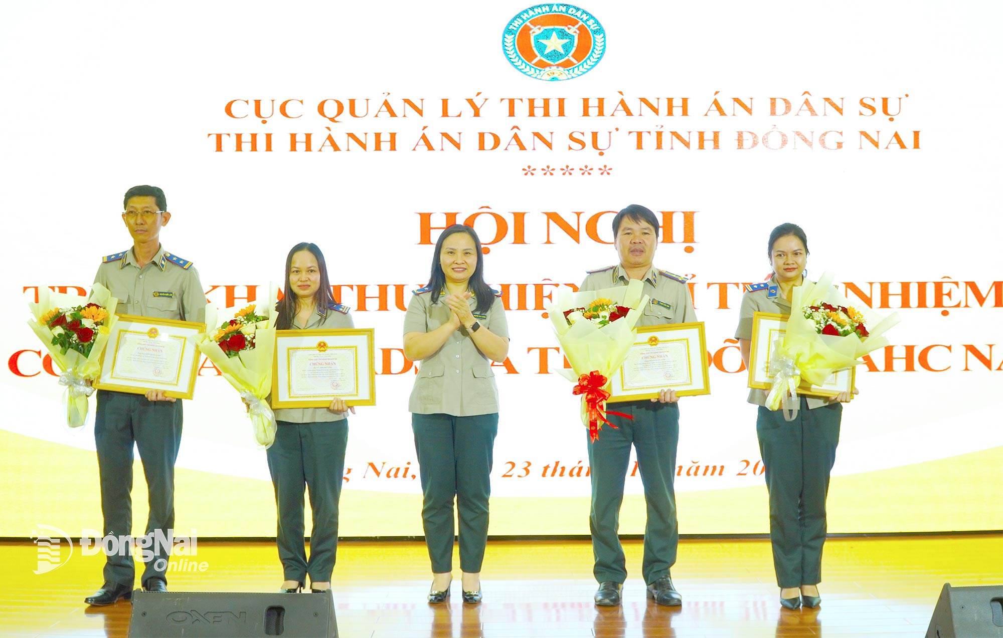 Phó Cục trưởng Cục Quản lý thi hành án dân sự (Bộ Tư pháp) Nguyễn Thị Hoàng Giang trao chứng nhận điển hình tiên tiến cơ sở của Cục Quản lý thi hành án dân sự cho 4 cá nhân đạt thành tích xuất sắc trong nhiệm vụ. Ảnh: An Nhơn