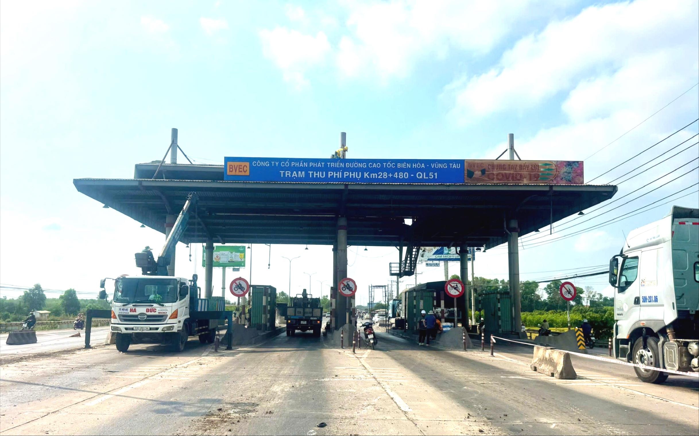 Trạm thu phí T1, T2 trên Quốc lộ 51 đoạn qua địa phận tỉnh Đồng Nai đang được tháo dỡ để trả lại sự thông thoáng cho các phương tiện lưu thông