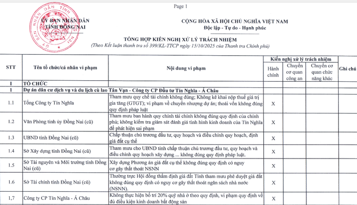UBND tỉnh Đồng Nai tổng hợp kiến nghị xử lý cá nhân, tập thể theo kết luật của Thanh tra Chính phủ