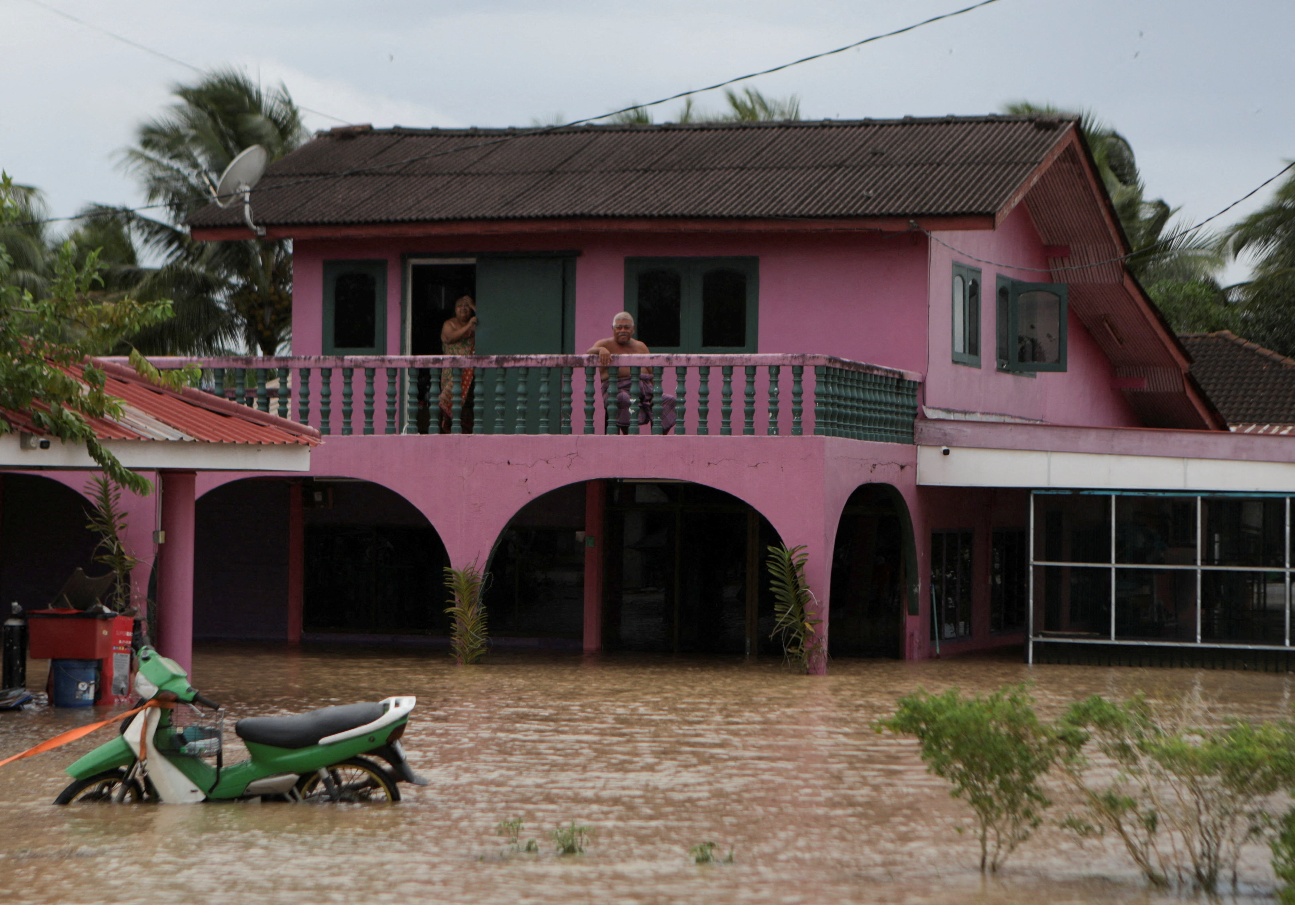 Tại Malaysia, mưa lớn tấn công 10 bang, buộc khoảng 18.000 người phải sơ tán tính đến ngày 25/11. Riêng bang Kelantan có hơn 9.700 người di tản đến 40 trung tâm cứu trợ, trong khi Selangor và Perak cũng chịu ảnh hưởng nặng nề. Người dân bị mắc kẹt trên tầng hai của ngôi nhà bị ngập lụt tại Kangar, Malaysia. Ảnh: Reuters.