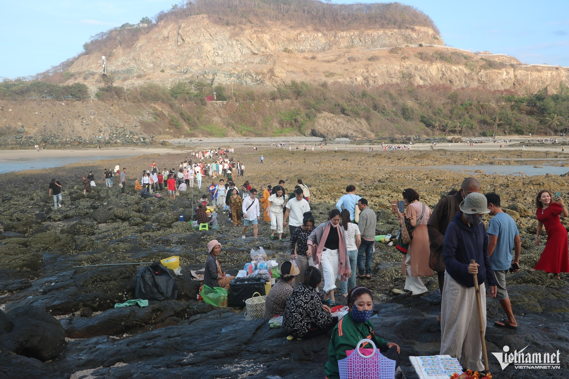 Ghi nhận của PV VietNamNet, thời điểm thủy triều rút, con đường đá dẫn ra miếu giữa biển lộ rõ. Từ khoảng 4-5h, dòng người đã men theo lối đi tự nhiên này để ra miếu làm lễ. Không cố định về thời gian mà tùy theo con nước, nước biển sẽ rút vào buổi sáng sớm, buổi chiều hoặc buổi đêm.
