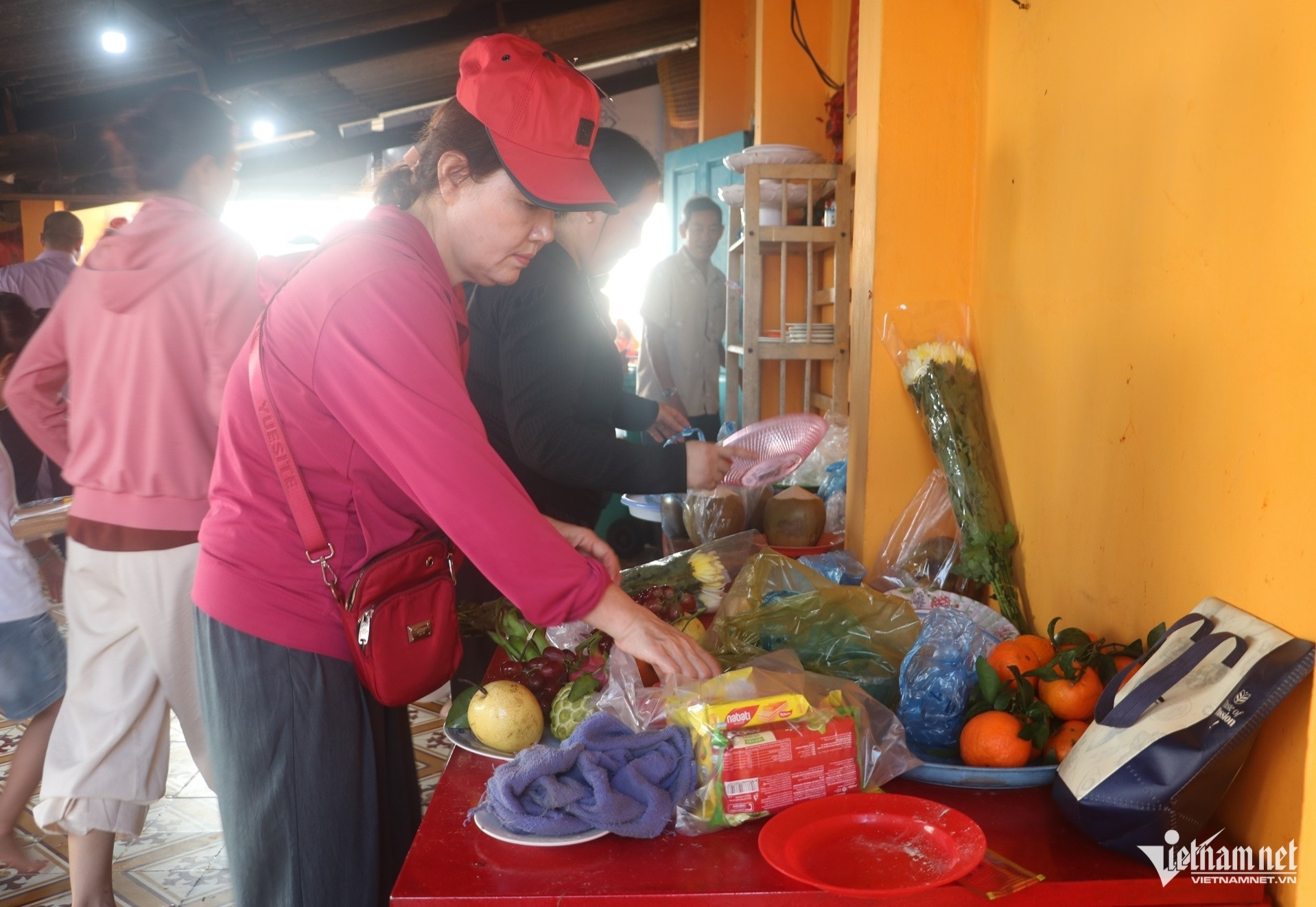 Du khách bày soạn lễ vật cho vào mâm, chuẩn bị dâng lên bàn thờ bên trong chánh điện.