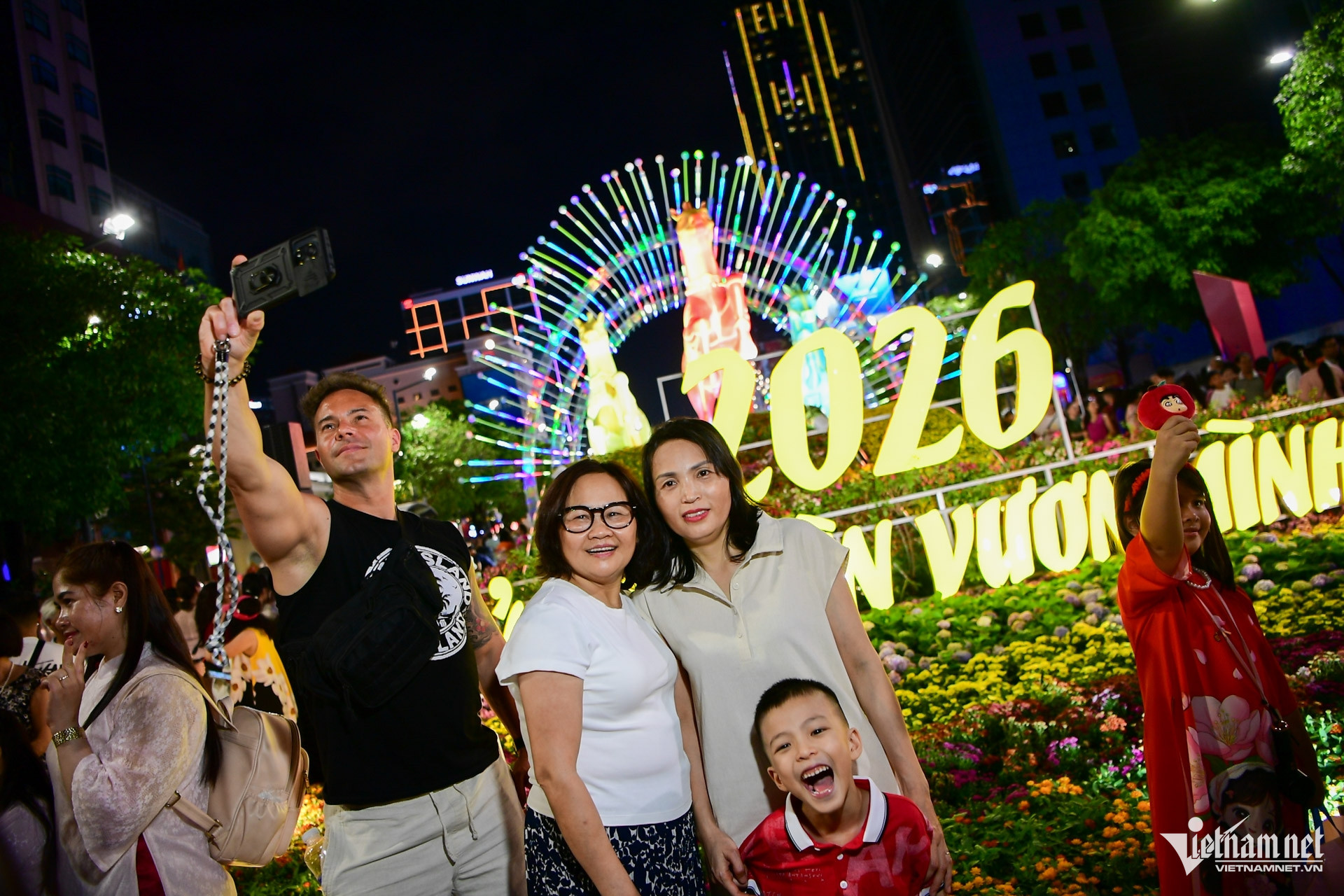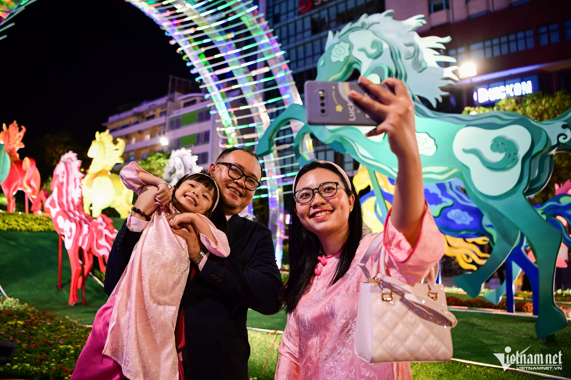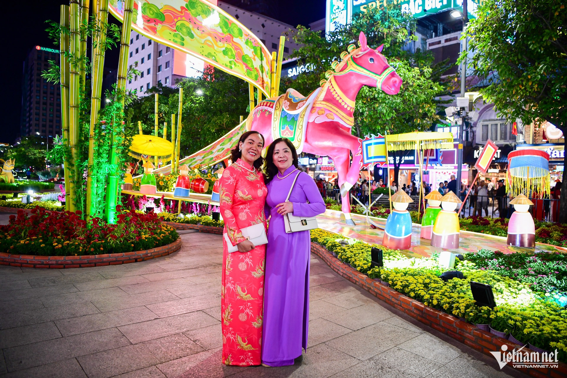 Các đại cảnh “Nhất mã thong dong”, "Lý ngựa ô", "Rực rỡ miền ký ức"... rực rỡ trong đêm. Bà Lan cùng bạn năm nào cũng đến tham quan đường hoa Nguyễn Huệ để cảm nhận không khí Tết giữa lòng thành phố.