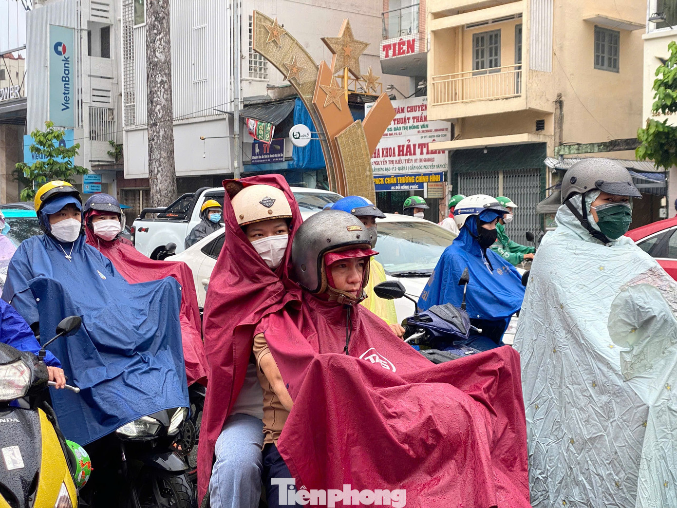 Người dân TPHCM đội mưa đi học, đi làm trong buổi sáng đầu tuần.