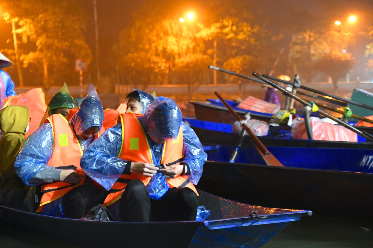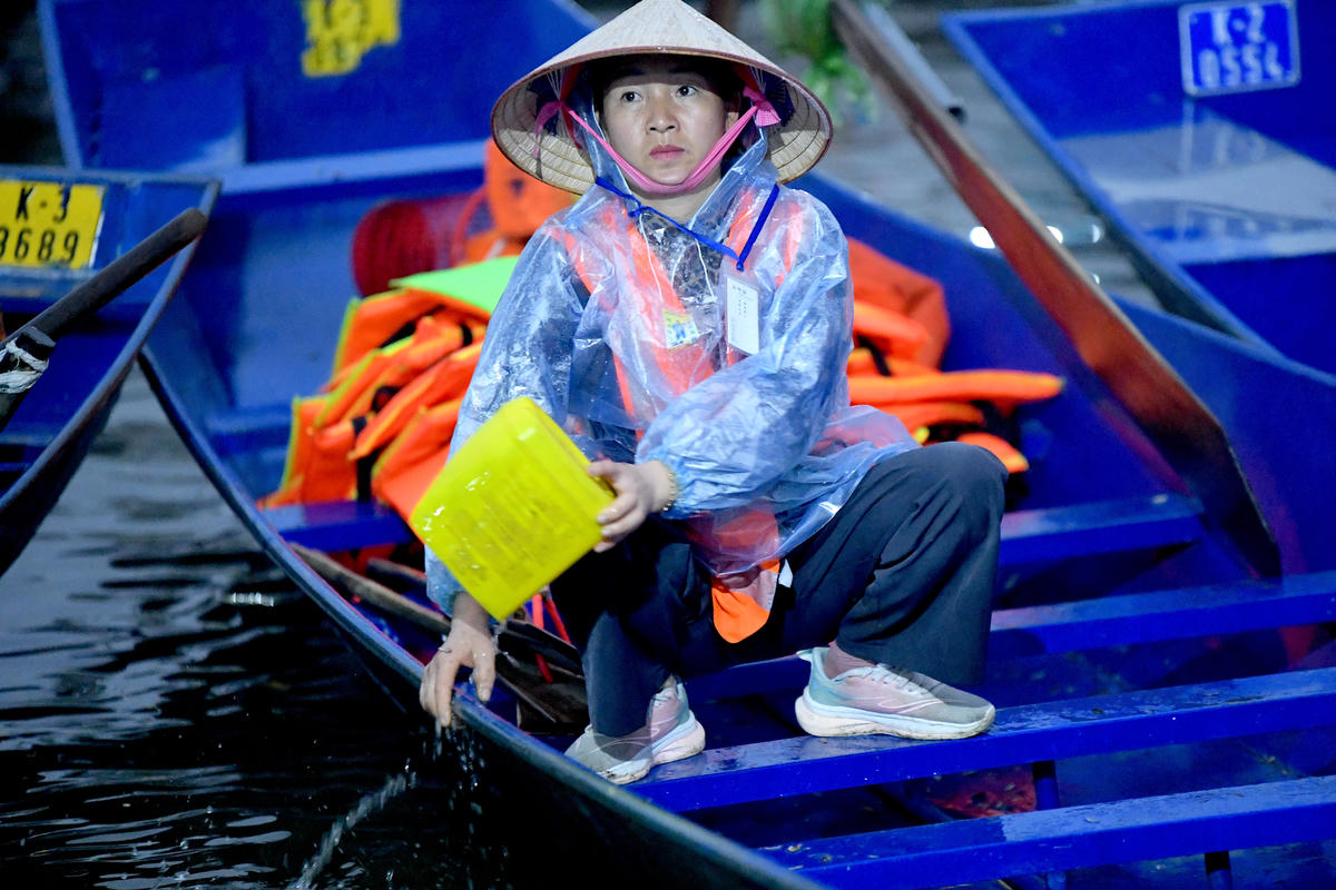 Cơn mưa kéo dài, các chủ đò khẩn trương tát nước, bảo đảm an toàn, sẵn sàng phục vụ du khách. Ảnh: Phạm Sỹ.
