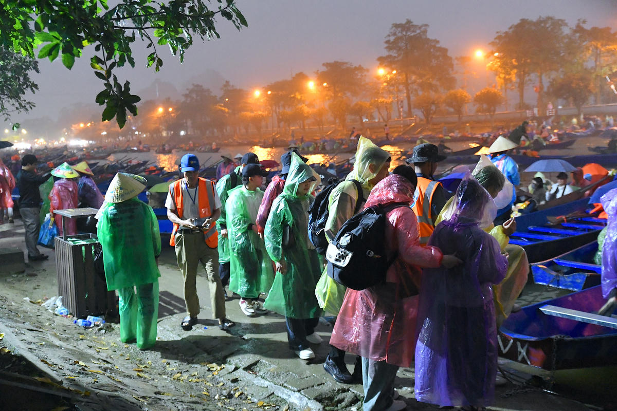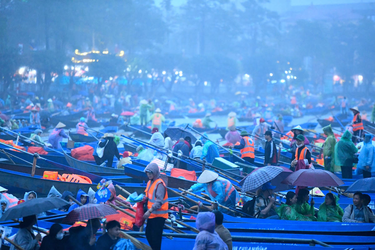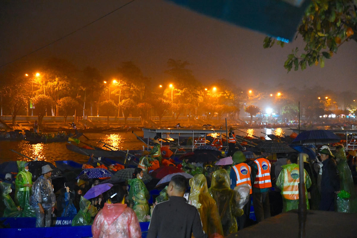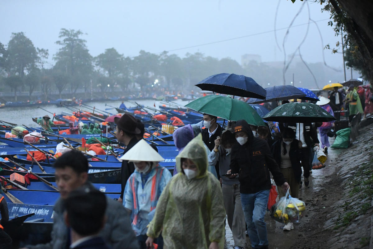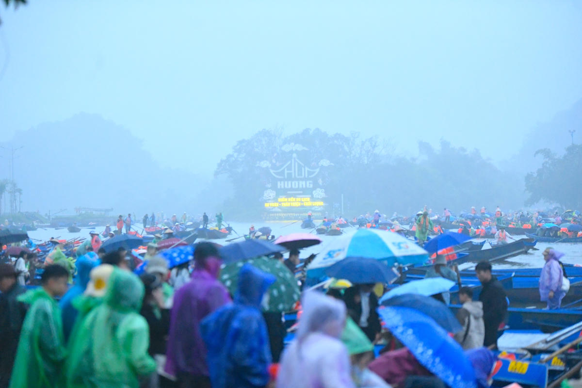 Ngay từ tờ mờ sáng, bất chấp mưa xuân, du khách tập trung tại bến đò để vào khu di tích chùa Hương dự lễ khai hội. Ảnh: Phạm Sỹ.