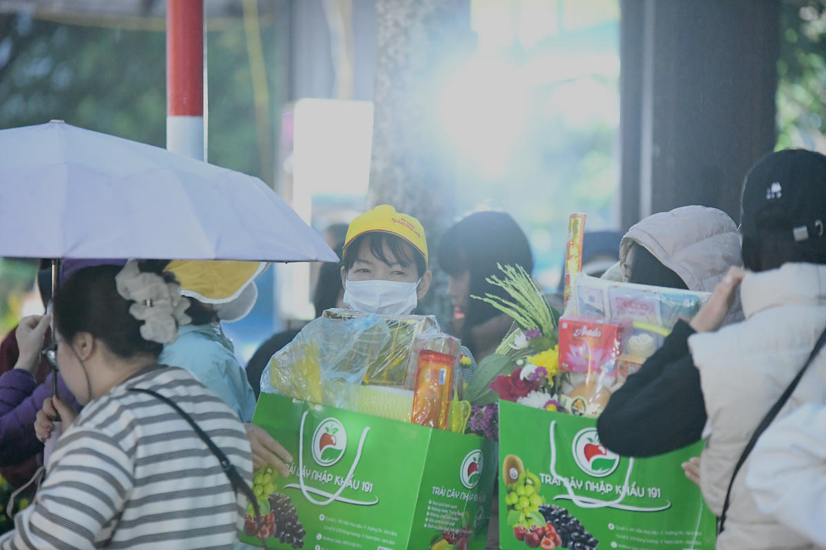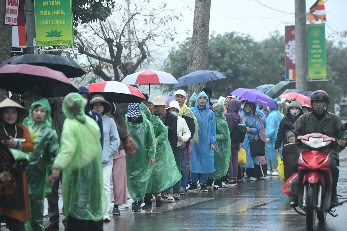 Trong mưa xuân, du khách thập phương mang theo lễ vật, thành tâm về chùa Hương hành lễ. Ảnh: Phạm Sỹ.