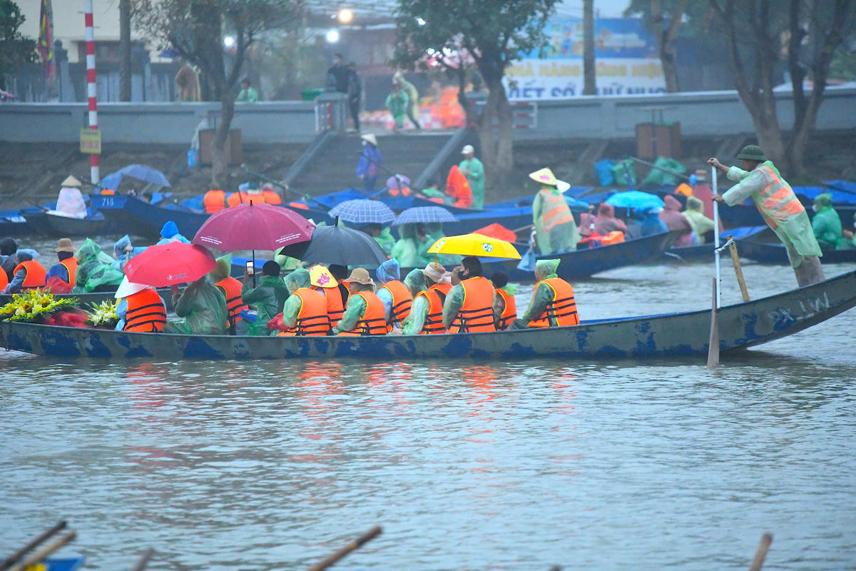 Dù mưa lớn dần từ sáng sớm, lượng khách hành hương về chùa Hương vẫn không ngừng tăng. Ảnh: Phạm Sỹ.