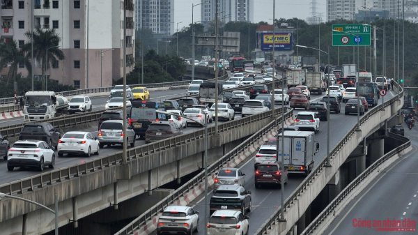 Theo ghi nhận của phóng viên Báo CAND, trên tuyến đường Vành đai 2 hướng về cầu Vĩnh Tuy (đoạn qua Minh Khai), phương tiện ở cả hai chiều nối đuôi nhau kéo dài, di chuyển chậm do lưu lượng tăng đột biến.