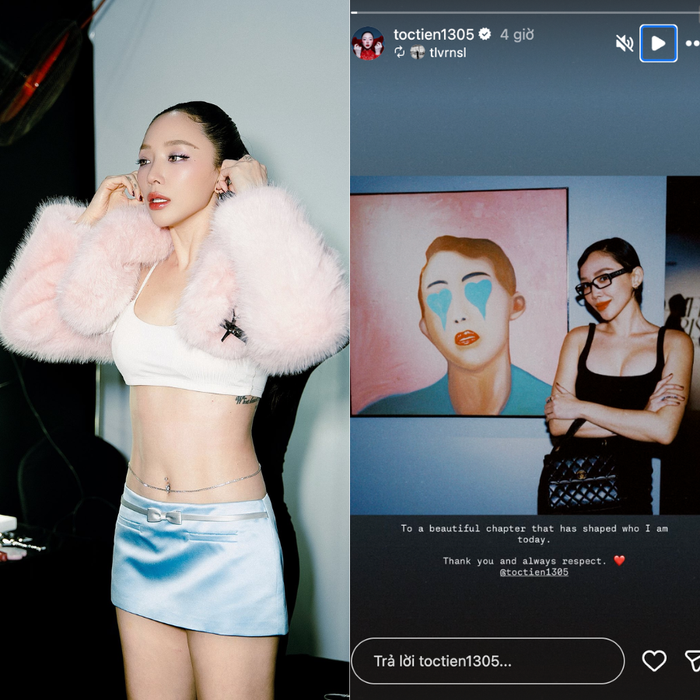 Mới đây Tóc Tiên tiếp tục có động thái khiến nhiều người bất ngờ khi chia sẻ lại story của Hoàng Touliver được đăng ngay sau khi cô công bố tin chia tay. Trong story này, nam producer viết: “To a beautiful chapter that has shaped who I am today. Thank you and always respect” (tạm dịch: “Gửi đến chương đẹp đã định hình con người anh ở hiện tại. Cảm ơn em và luôn luôn tôn trọng”).