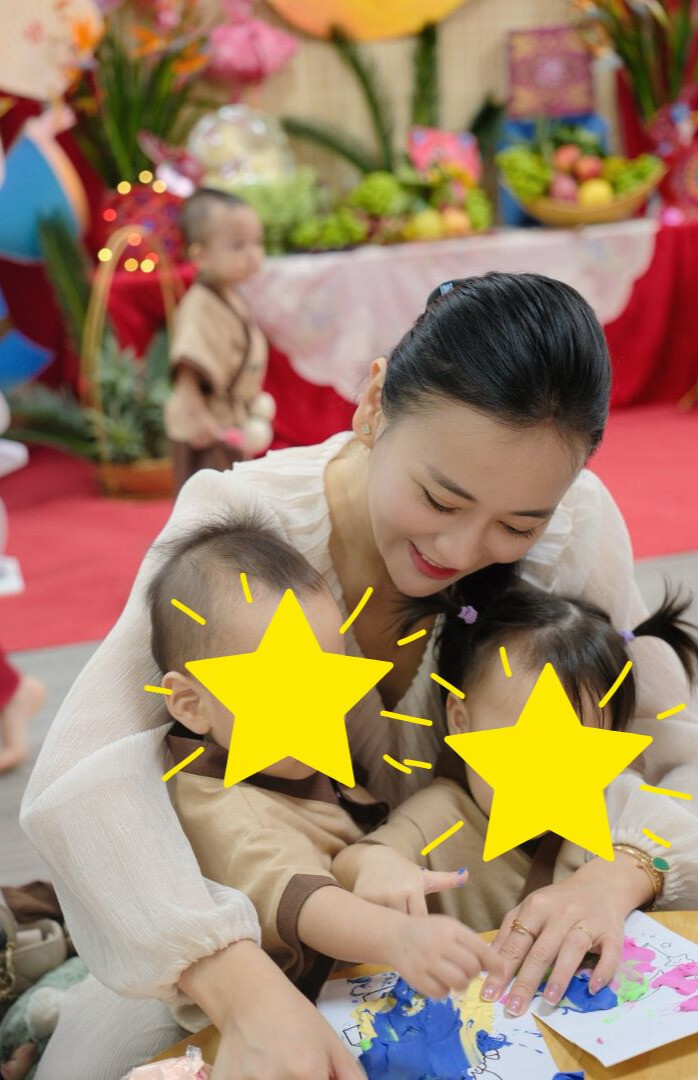 Trong bức ảnh được đăng tải lên trang cá nhân, cô mặc trang phục giản dị, khuôn mặt rạng rỡ hạnh phúc khi cùng hai bé tham gia hoạt động tô màu trong không gian đầy sắc màu lễ hội.