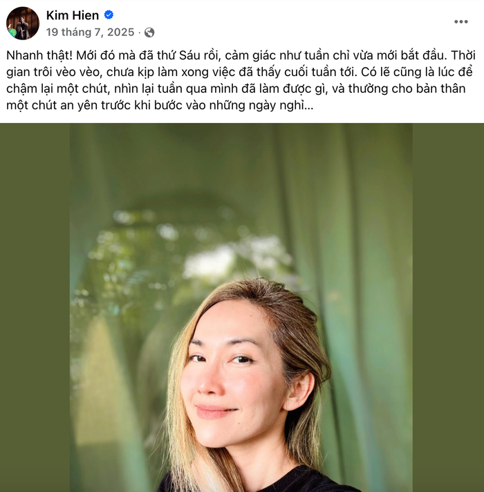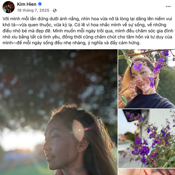 Sang ngày 18/7, nữ diễn viên tiếp tục chia sẻ những suy nghĩ nhẹ nhàng hơn, nói về niềm vui khi đứng dưới ánh nắng, nhìn hoa nở, mong muốn chăm sóc gia đình nhỏ xíu và nuôi dưỡng đời sống tinh thần mỗi ngày. Dòng trạng thái mang màu sắc bình yên, nhưng cũng cho thấy Kim Hiền đang tập trung nhiều hơn vào thế giới nội tâm và những giá trị cá nhân.
