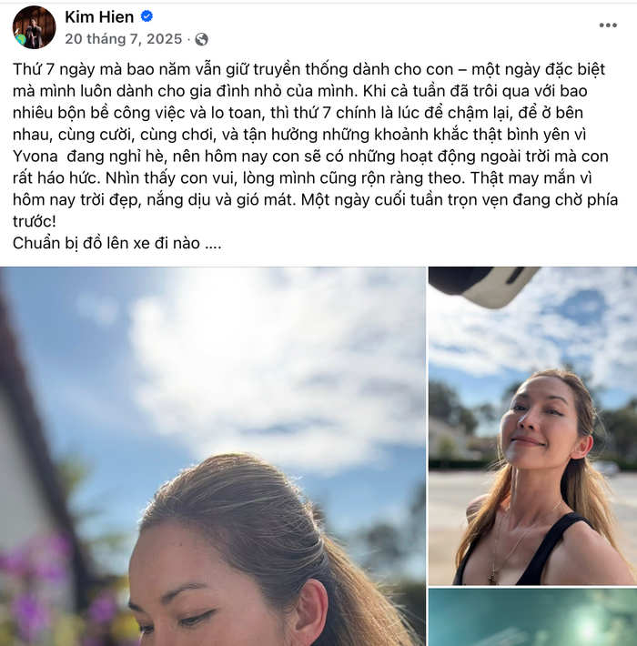 Ngày 20/7, Kim Hiền dành trọn các bài đăng để nói về con cái. Nữ diễn viên cho biết cô vẫn giữ thói quen dành ngày thứ bảy cho các con, xem đó là truyền thống nhiều năm nay. Cô kể về kế hoạch đưa con đi chơi, các hoạt động ngoài trời trong kỳ nghỉ hè, niềm vui khi nhìn con háo hức và hạnh phúc.