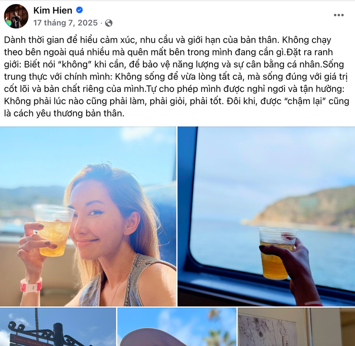 Cụ thể, đúng ngày 17/7/2025 - trùng với thời điểm phán quyết ly hôn có hiệu lực, Kim Hiền đăng tải một dòng trạng thái dài, nói về việc thấu hiểu cảm xúc bản thân, đặt ra ranh giới cá nhân, sống trung thực với chính mình và cho phép bản thân được chậm lại, nghỉ ngơi. Bài viết không nhắc trực tiếp đến hôn nhân hay ly hôn, nhưng lại mang nhiều tầng cảm xúc, khiến khán giả không khỏi liên tưởng.