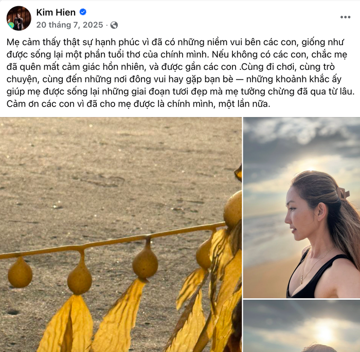 Không dừng lại ở đó, Kim Hiền tiếp tục chia sẻ cảm xúc làm mẹ, bày tỏ niềm hạnh phúc khi được ở bên các con, được sống lại những cảm xúc hồn nhiên, tươi đẹp tưởng chừng đã lùi xa. Những dòng tâm sự cho thấy con cái hiện là điểm tựa tinh thần lớn nhất của nữ diễn viên sau biến cố hôn nhân.