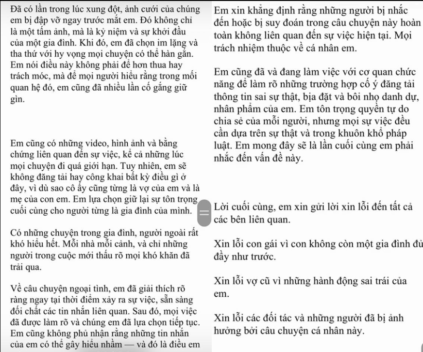 Bên cạnh đó, Thắng gửi lời xin lỗi tới các đối tác, bạn bè và những người đã tin tưởng mình nhưng bị ảnh hưởng bởi ồn ào trong thời gian qua.