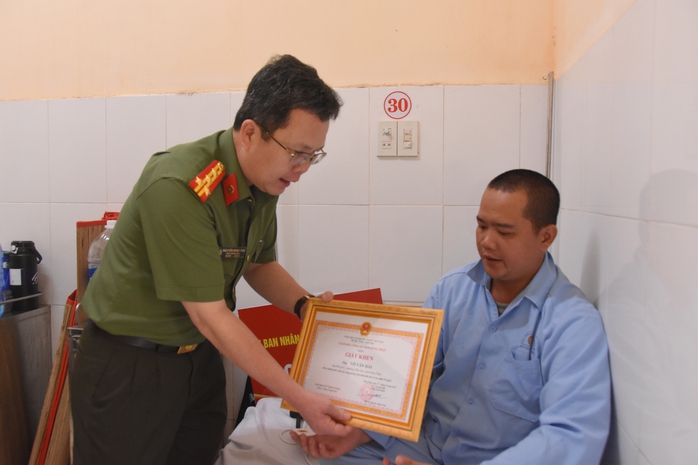 Đại tá Nguyễn Minh Tân, Phó Giám đốc Công an tỉnh Đồng Tháp, trao giấy khen của Giám đốc Công an tỉnh tặng anh Võ Văn Hải
