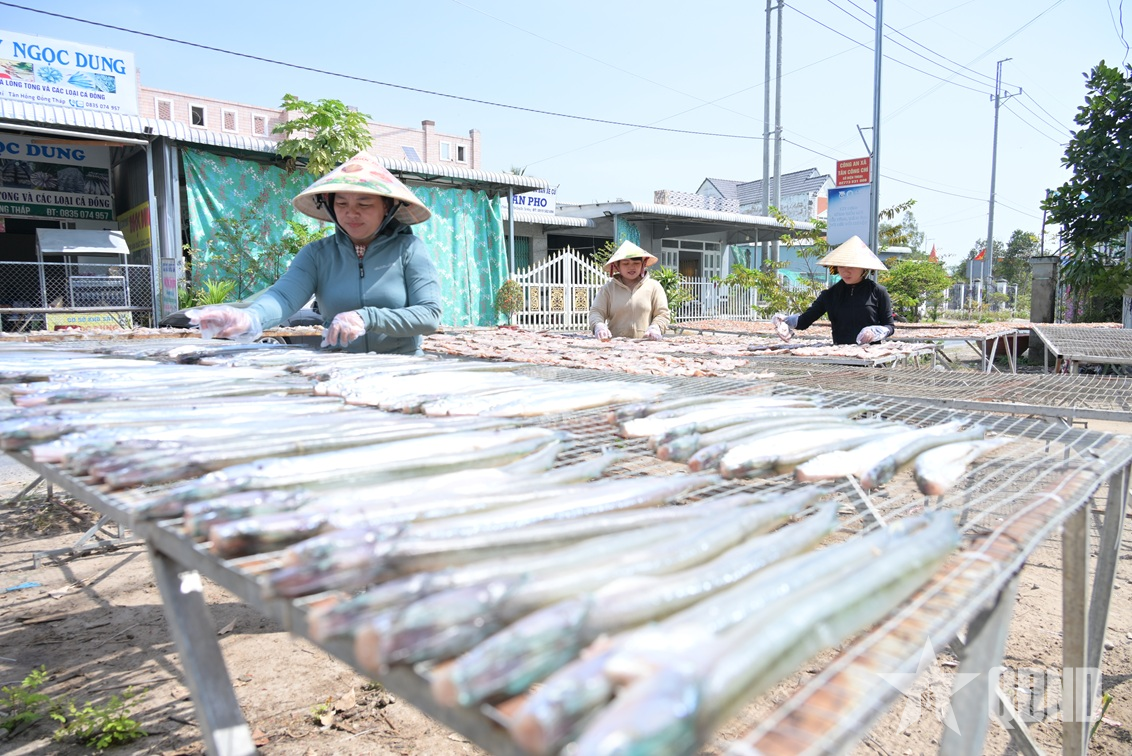 Đến xã Tân Hồng (Đồng Tháp) vào thời điểm này, mọi người sẽ được chứng kiến rất nhiều giàn phơi đầy các loại cá đón nắng và sự tất bật của các công nhân tại các cơ sở làm cá khô để chuẩn bị cho thị trường Tết.