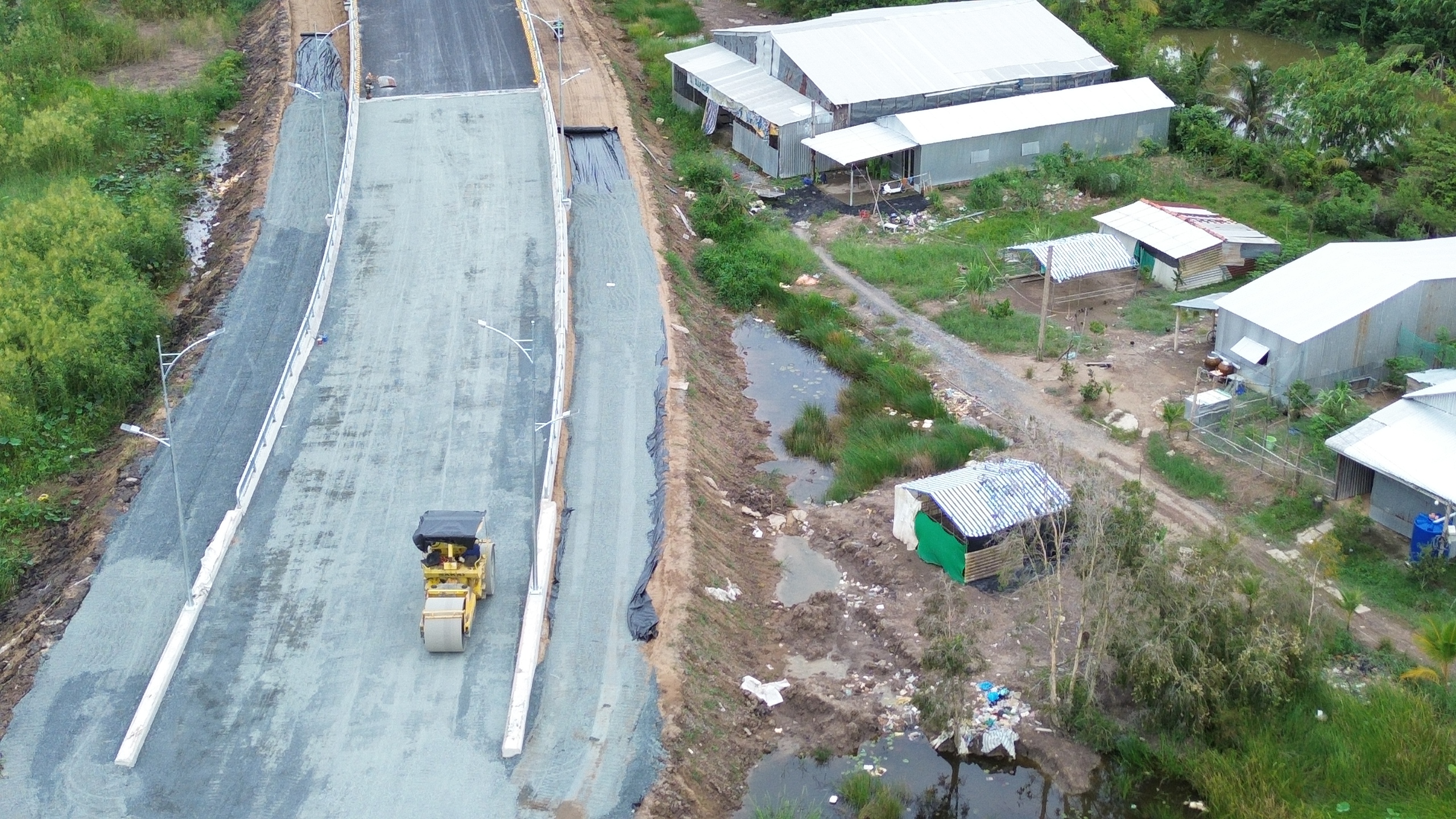 Đơn vị thi công đang khẩn trương hoàn thiện các hạng mục đường gom dân sinh, khe co giãn, lan can cầu. Phần đường dẫn đã xong nền đường, chuẩn bị thảm nhựa khi thời tiết thuận lợi.