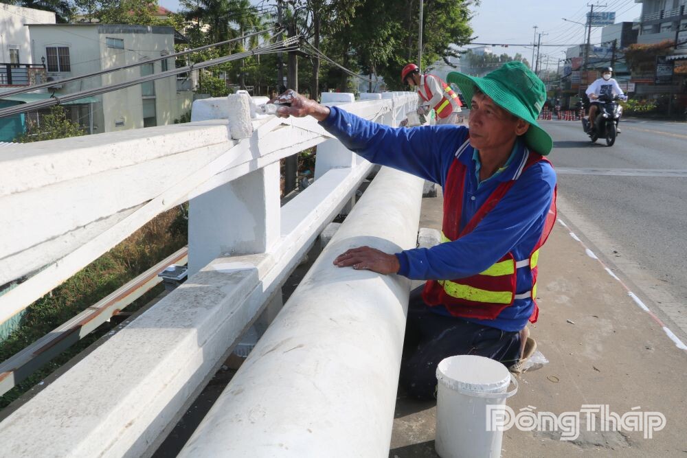 Phường Cao Lãnh bố trí lực lượng sơn mới lan can, vạch kẻ tại các cây cầu ở khu vực trung tâm của phường.