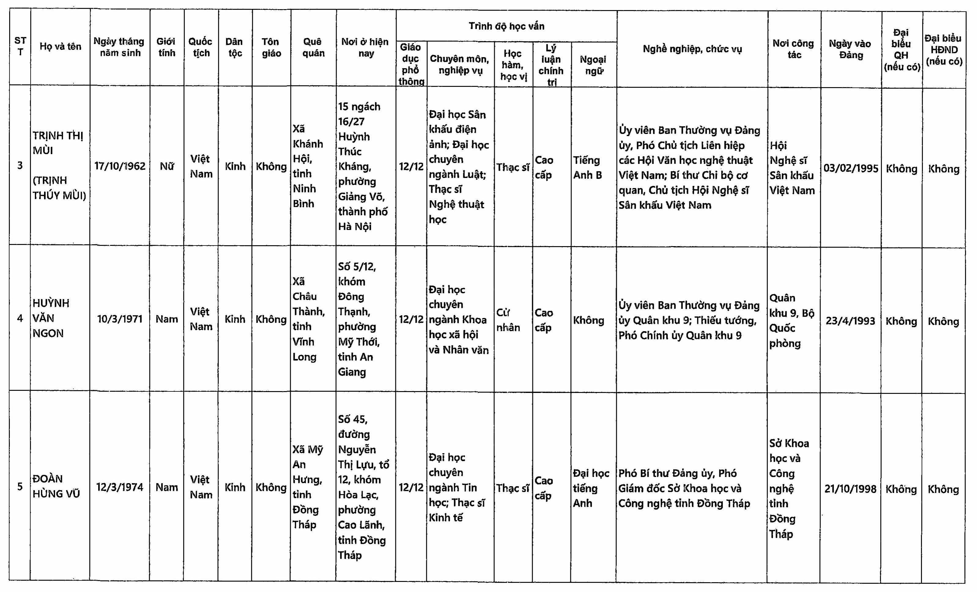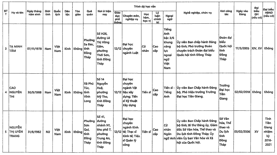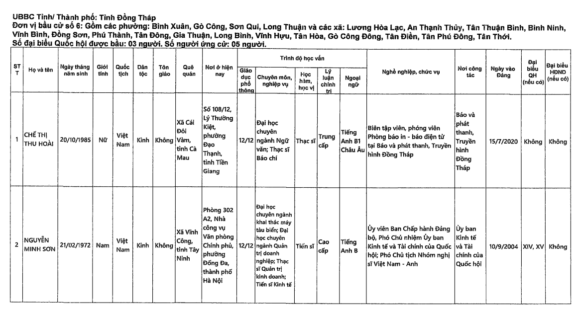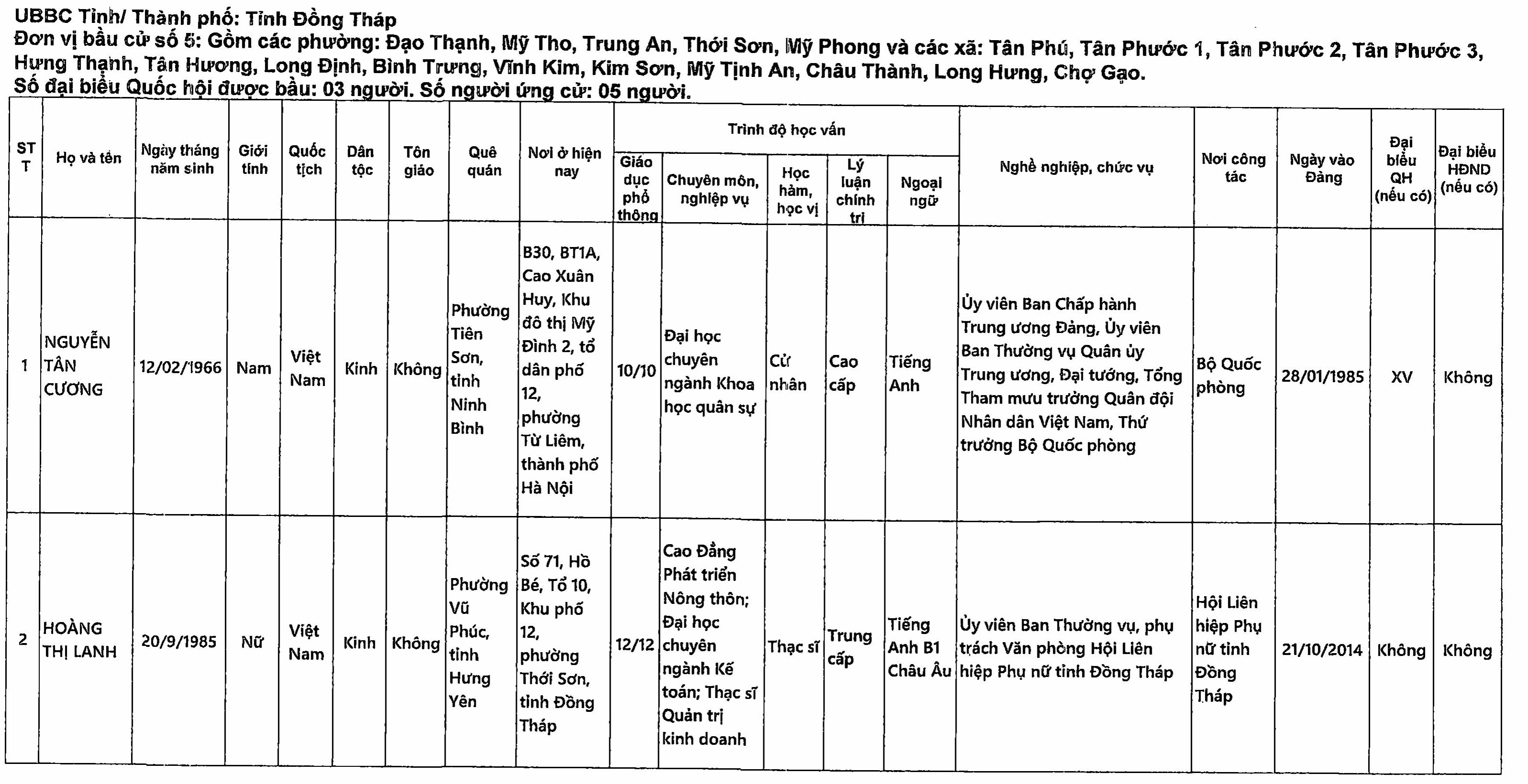 Dưới đây là danh sách chi tiết 30 người ứng cử ĐBQH Khóa XVI tại tỉnh Đồng Tháp: