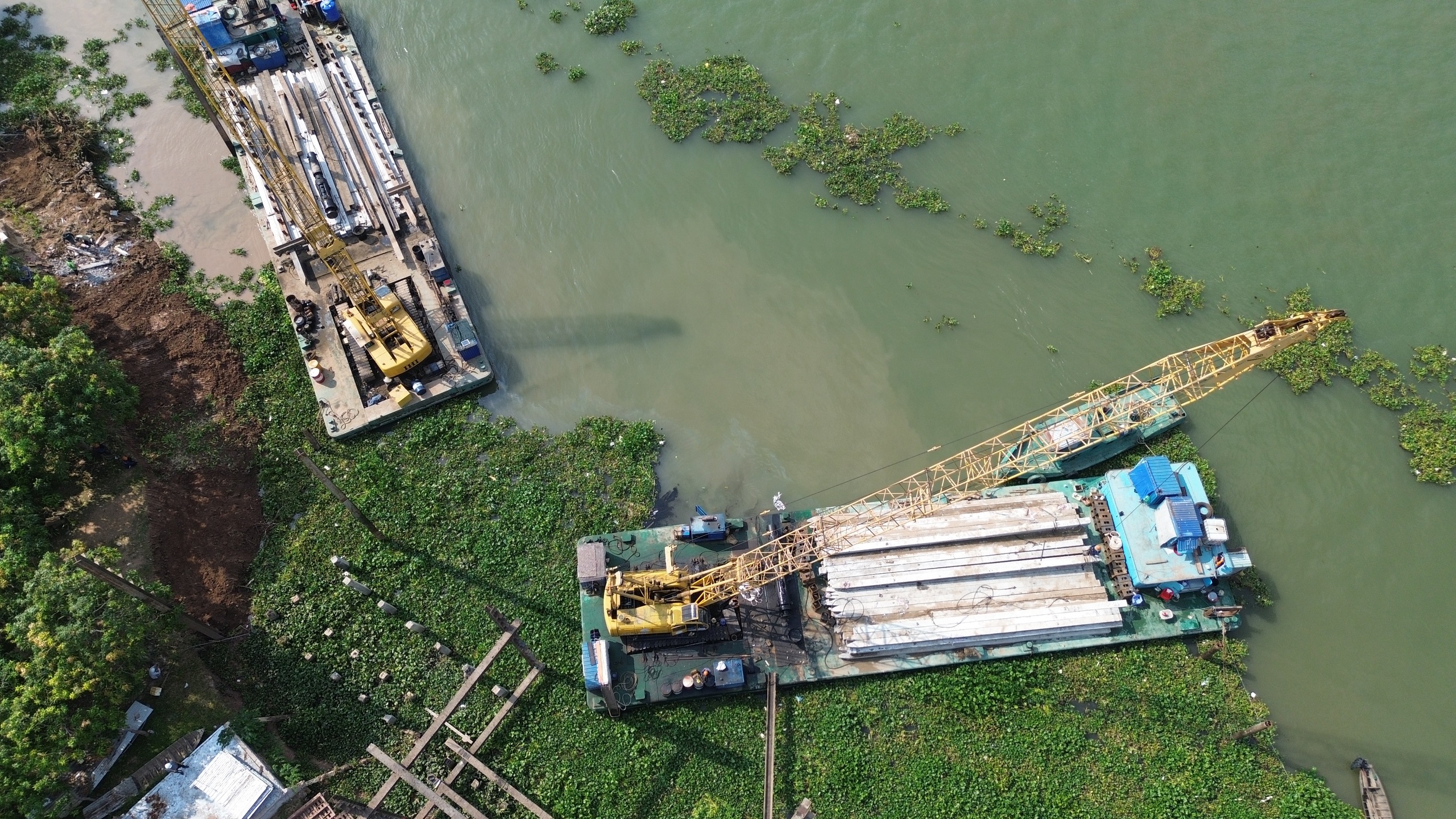 Sà lan vận chuyển thiết bị, dầm bê tông thi công bờ kè.