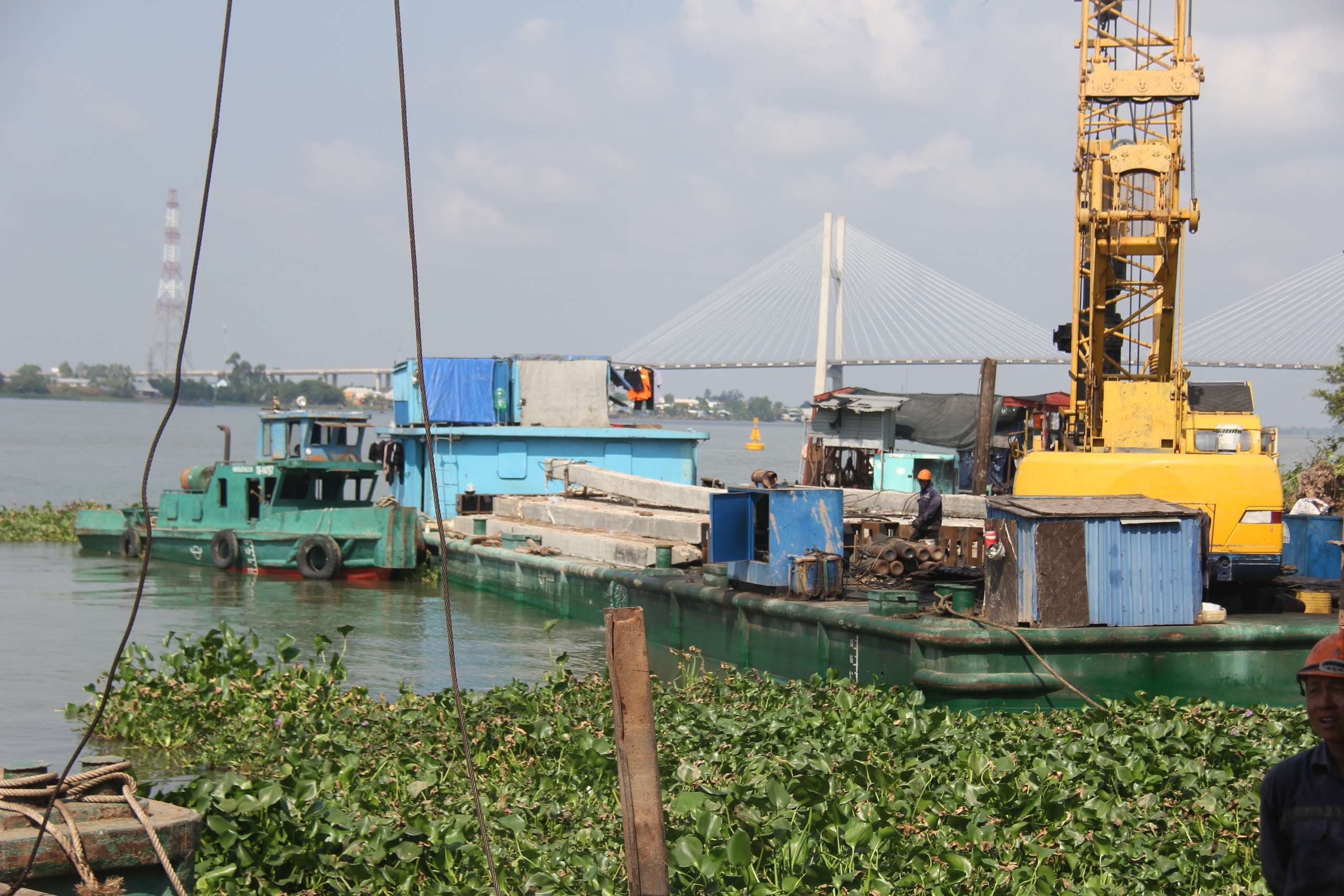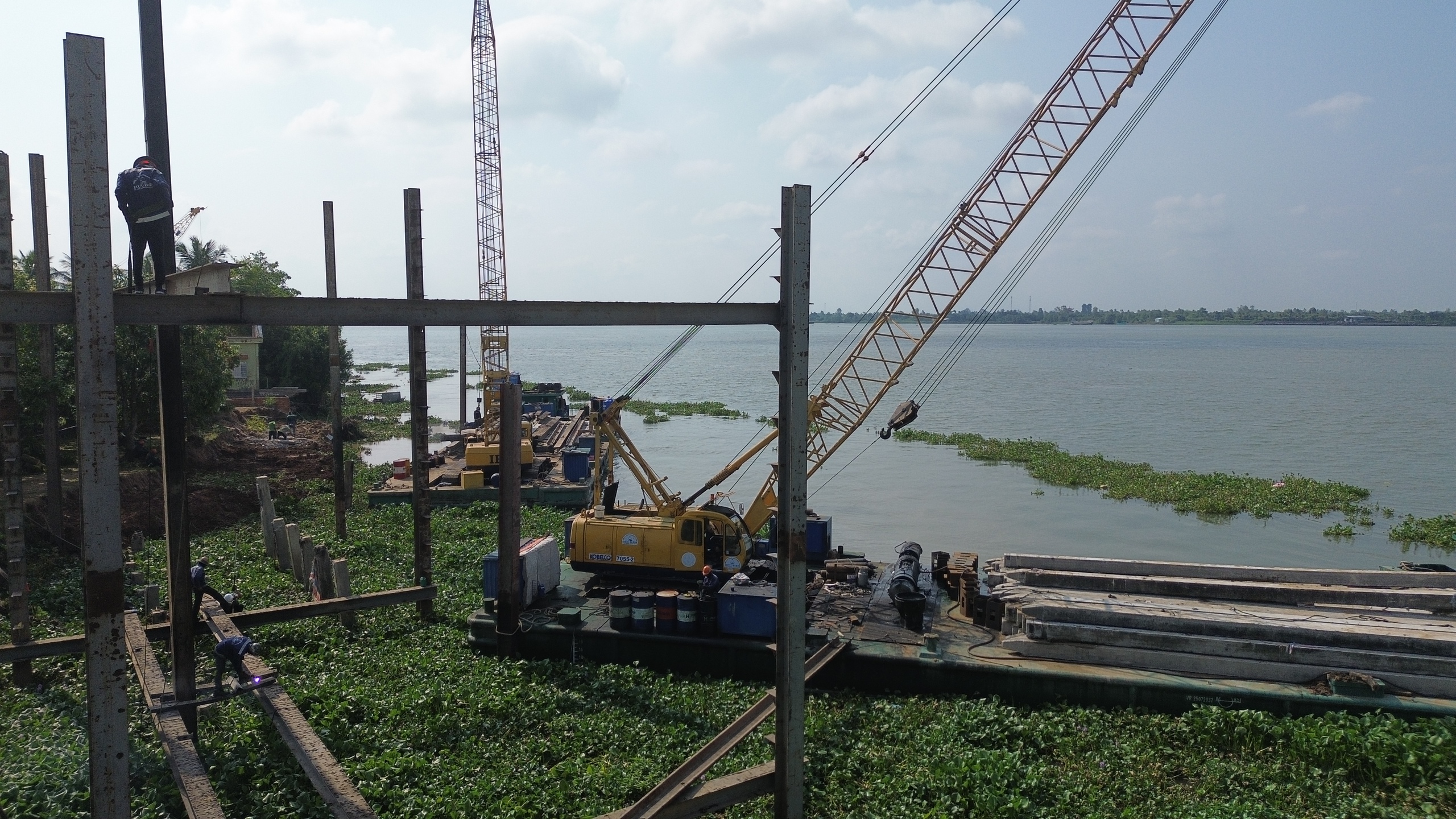 Hàng chục công nhân, kỹ sư chia làm hai mũi thi công làm việc trên bờ và sà lan dưới sông triển khai đóng cọc gia cố bờ kè, phòng chống sạt lở.