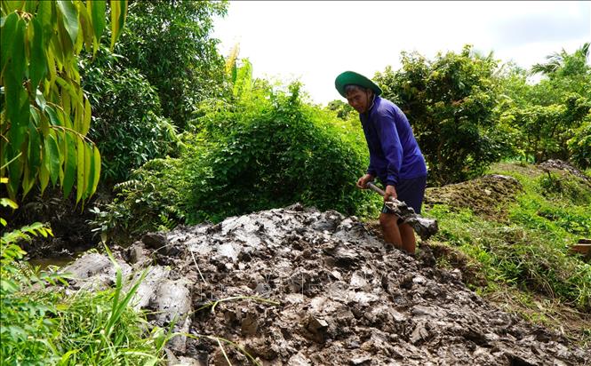 Ông Đặng Văn Hùng ở ấp Bình Mỹ B, xã Mỹ Hiệp (tỉnh Đồng Tháp) chủ động gia cố bờ bao, bảo vệ vườn cây ăn quả trước khả năng ngập úng do triều cường.