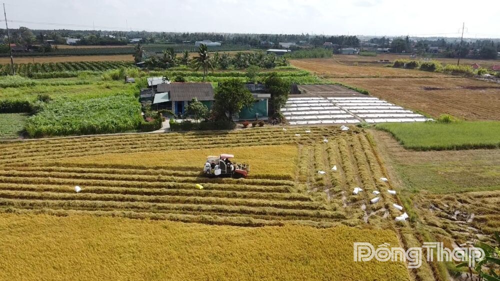 Ghi nhận vào trưa ngày 29-3, nông dân tại xã Đồng Sơn, tỉnh Đồng Tháp đang khẩn trương thu hoạch vụ lúa đông xuân. Lúc chúng tôi đến là thời điểm ông Nguyễn Văn Đức (ấp Thạnh Lạc, xã Đồng Sơn) vừa thu hoạch xong 0,5 ha lúa Đài Thơm 8.
