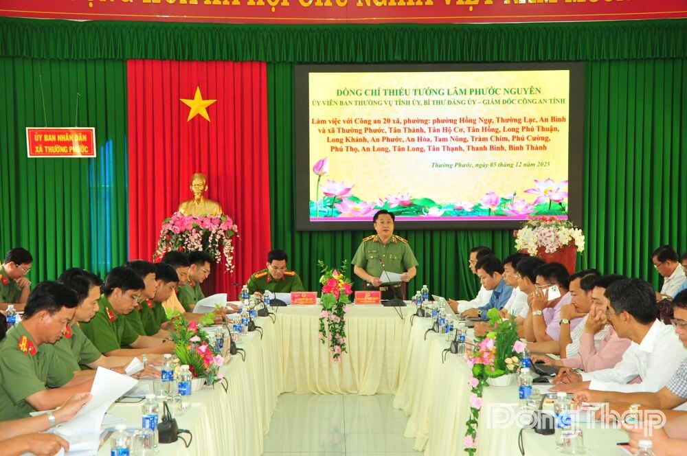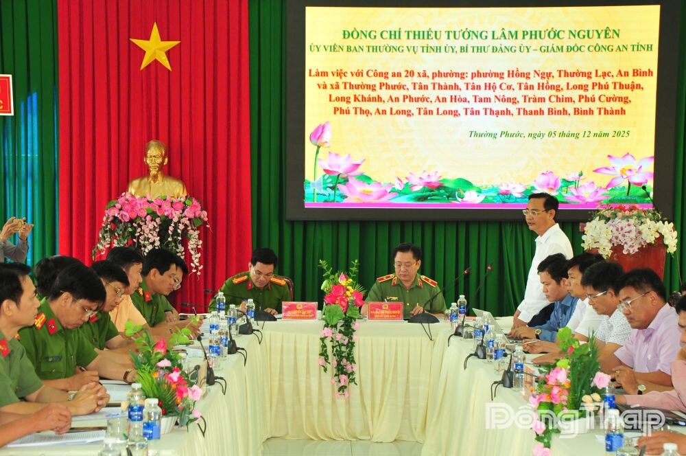 Thiếu tướng Lâm Phước Nguyên chỉ đạo Công an các đơn vị cấp tỉnh tiếp tục phối hợp, hướng dẫn, hỗ trợ giải quyết các vấn đề còn tồn đọng của lực lượng Công an cơ sở. Đối với Công an cấp xã tiếp tục phát huy vai trò nòng cốt trong tham mưu, phục vụ cấp ủy, chính quyền lãnh đạo, chỉ đạo thực hiện có hiệu quả công tác bảo đảm ANTT; tổ chức tốt công tác nắm tình hình, chủ động thực hiện các biện pháp đảm bảo an ninh tuyến biên giới và tập trung quyết liệt các giải pháp kéo giảm các vụ phạm tội xảy ra trên địa bàn.