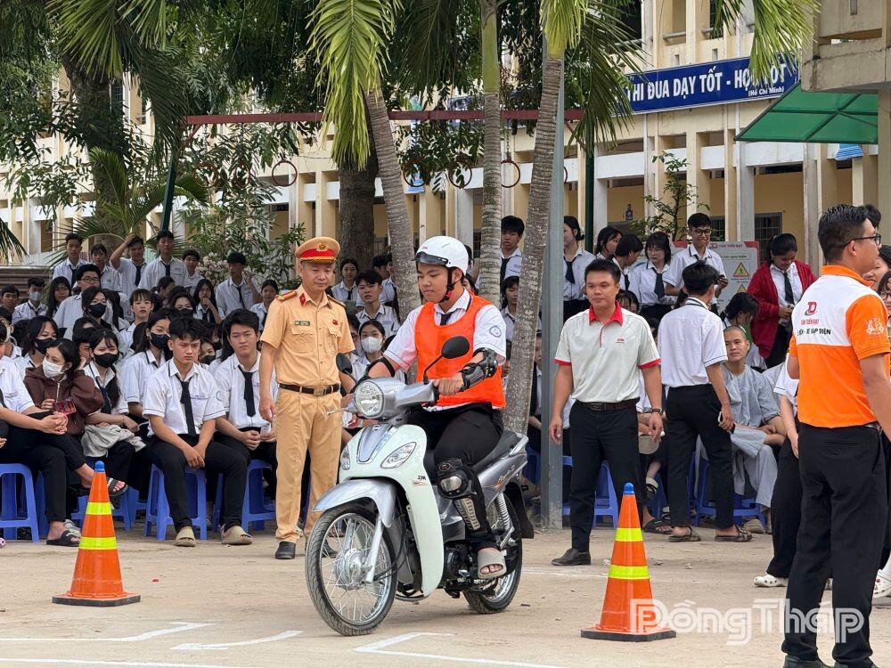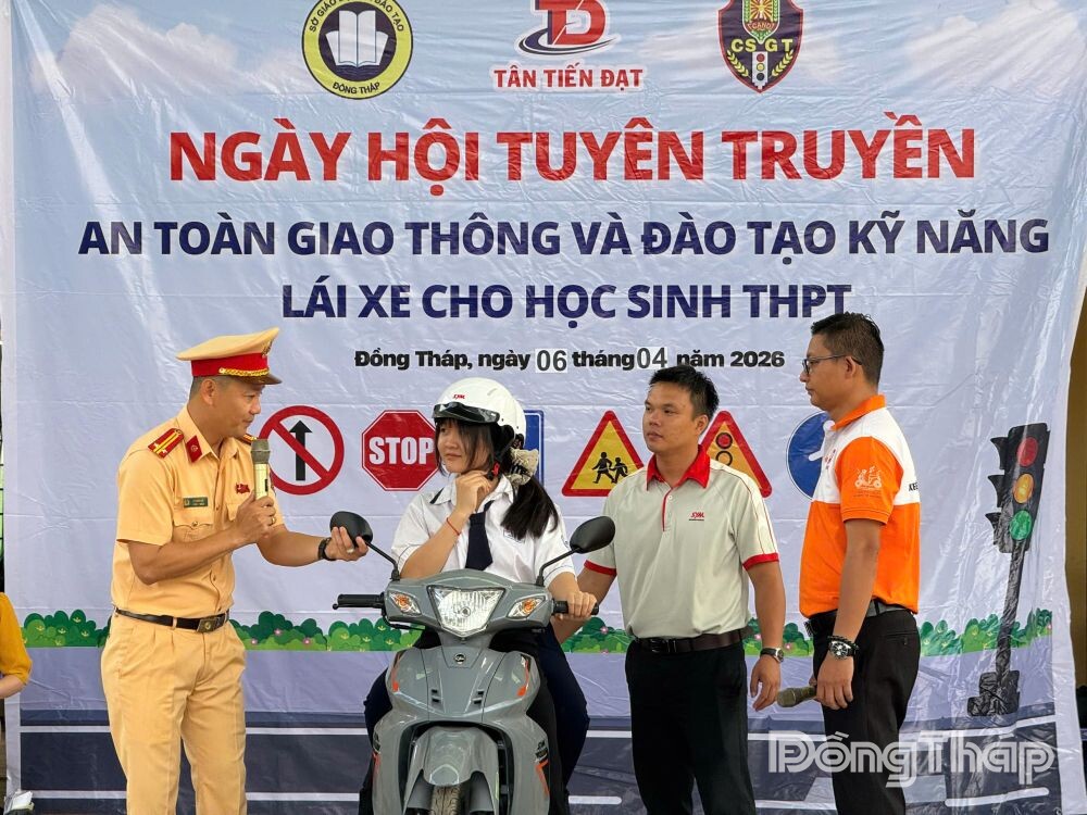 Ngoài nội dung lý thuyết, chương trình còn triển khai phần thực hành kỹ năng lái xe an toàn với sự phối hợp của Công ty TNHH MTV Xe máy Tân Tiến Đạt, theo yêu cầu của Cục CSGT (Bộ Công an).