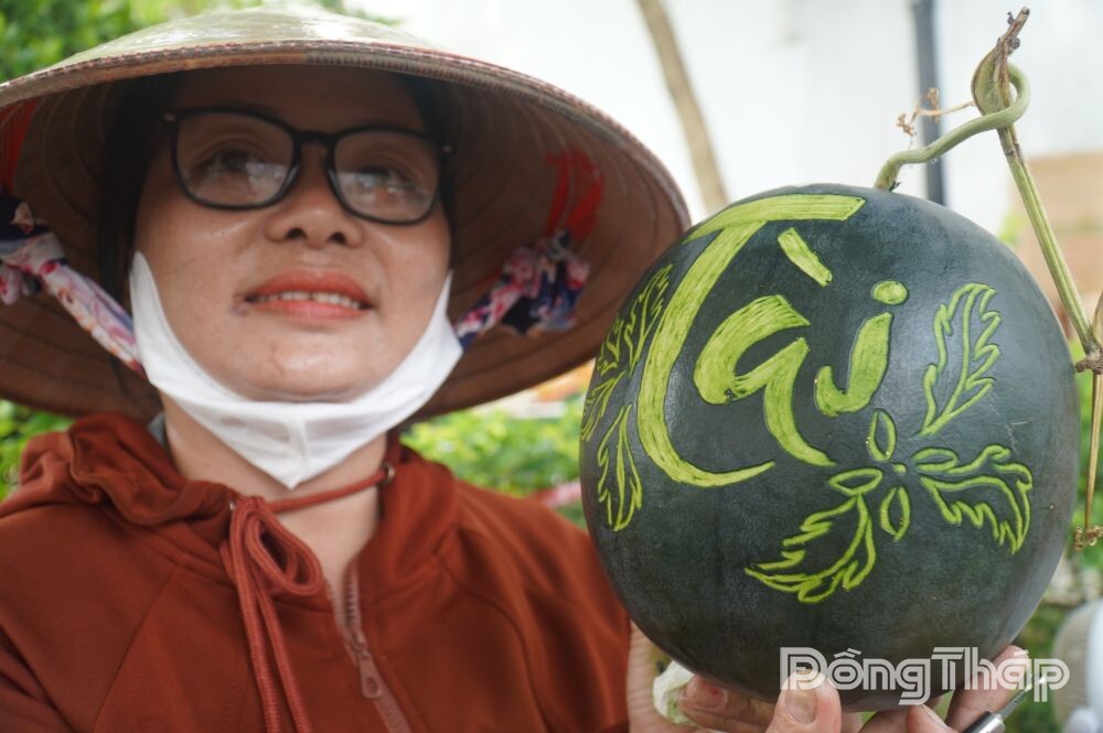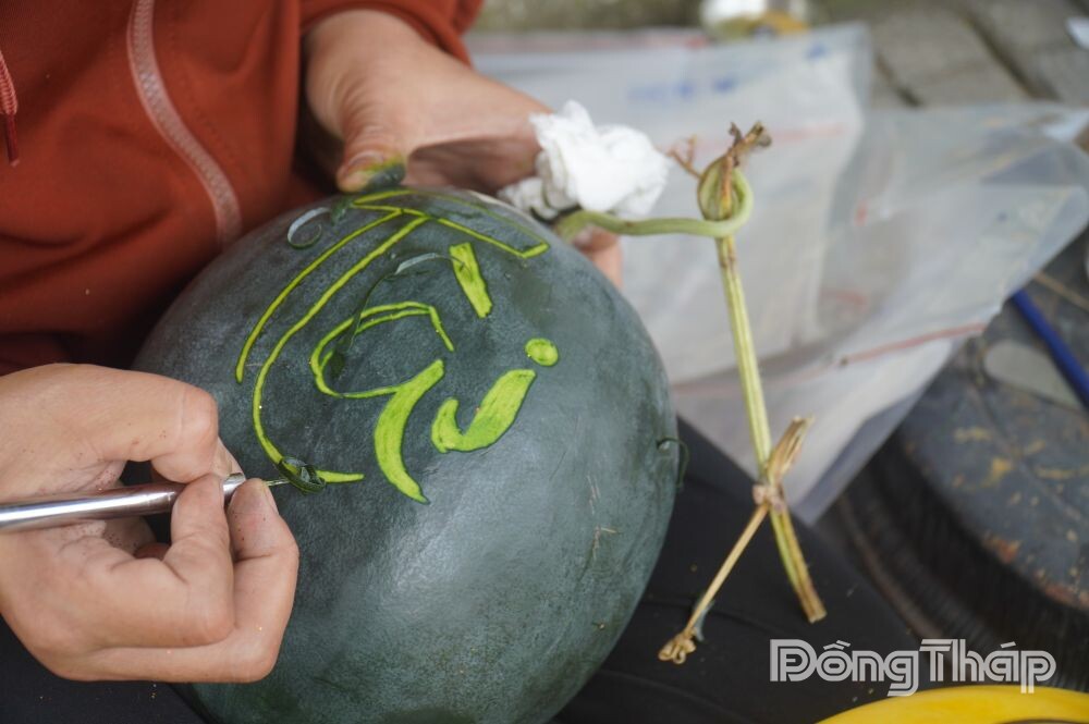 Để hoàn thành một trái dưa có chữ nổi rõ, đều và đẹp, người thợ phải dùng bút phác thảo trước, sau đó mới dùng dao khắc theo từng nét. Mỗi đường cắt đòi hỏi sự chính xác và nhẹ tay để không làm phạm vào phần ruột. Sau khi khắc xong, chị sẽ dùng một loại keo quét lên phần dưa vừa khắc, sau đó sẽ rắc kim tuyến lên, phần chữ sẽ nổi bật hơn.