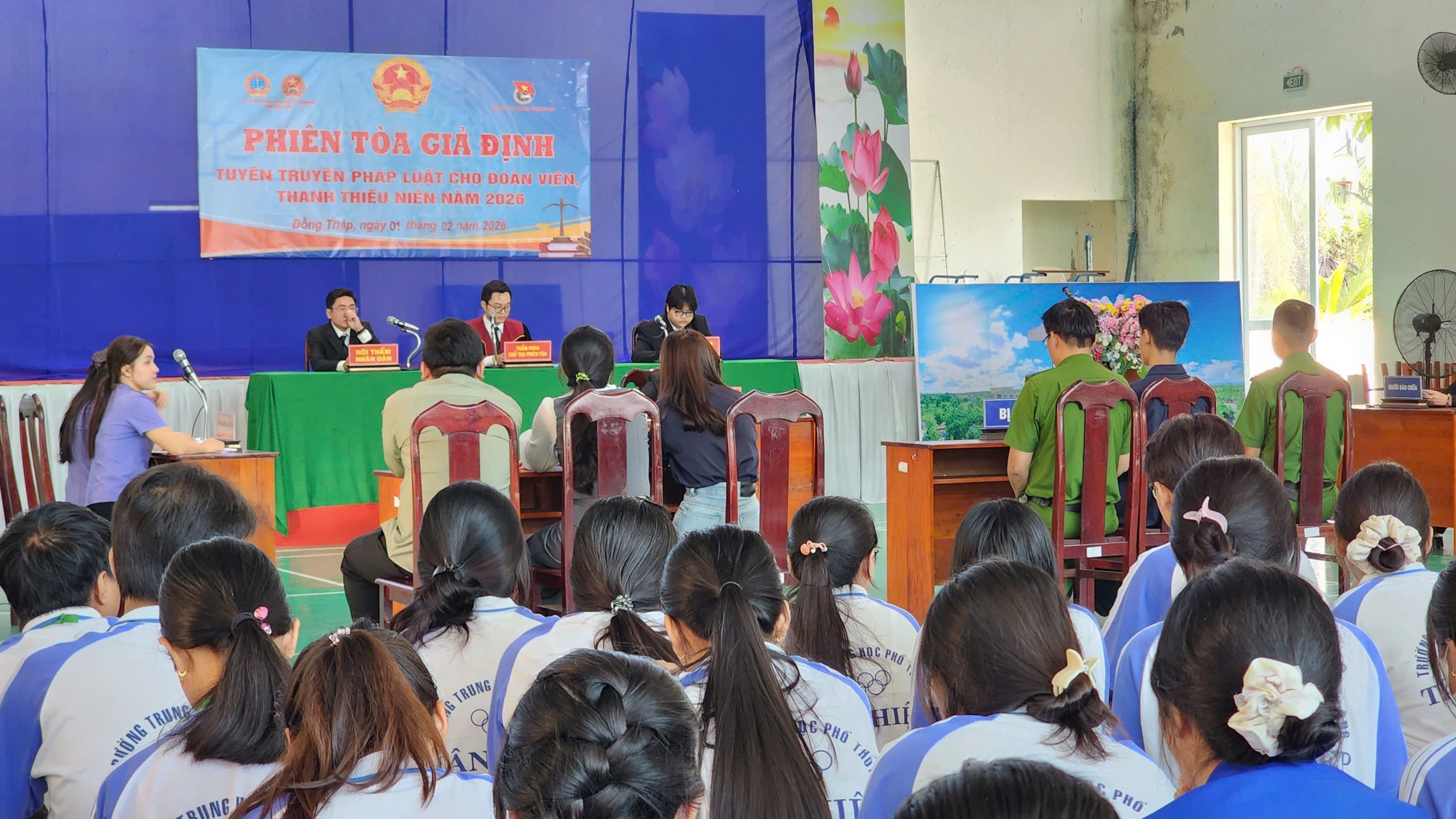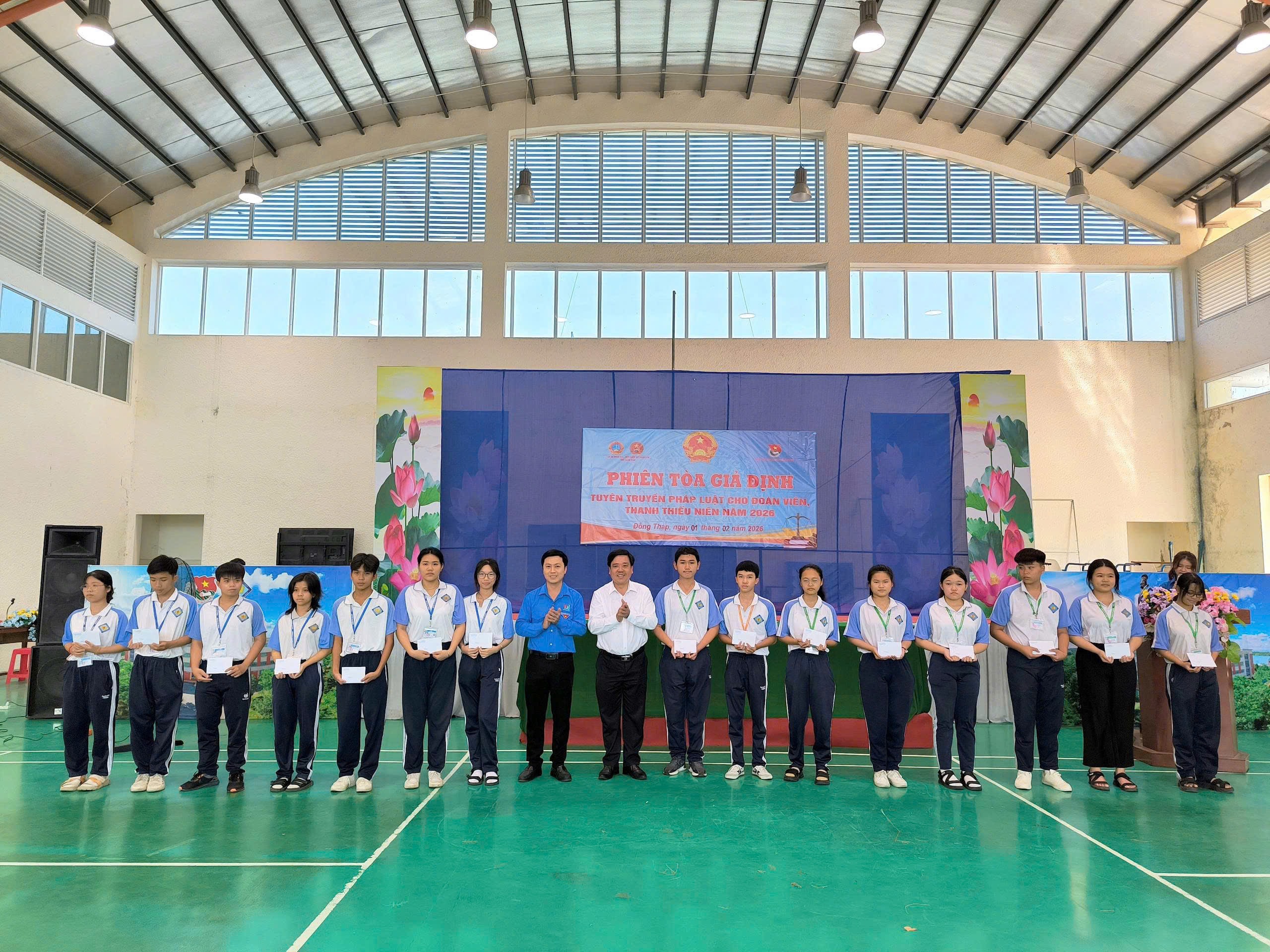 Đến dự phiên tòa giả định có Phó Chánh án Tòa án nhân dân tỉnh (TAND) Đồng Tháp Trần Văn Kiến, Ủy viên Ban Thường vụ Tỉnh đoàn Lê Nhật Thi, đại diện Viện kiểm sát nhân dân tỉnh cùng đại diện lãnh đạo TAND và Viện kiểm sát nhân dân Khu vực 3, lãnh đạo địa phương và thu hút trên 350 học sinh tham dự.