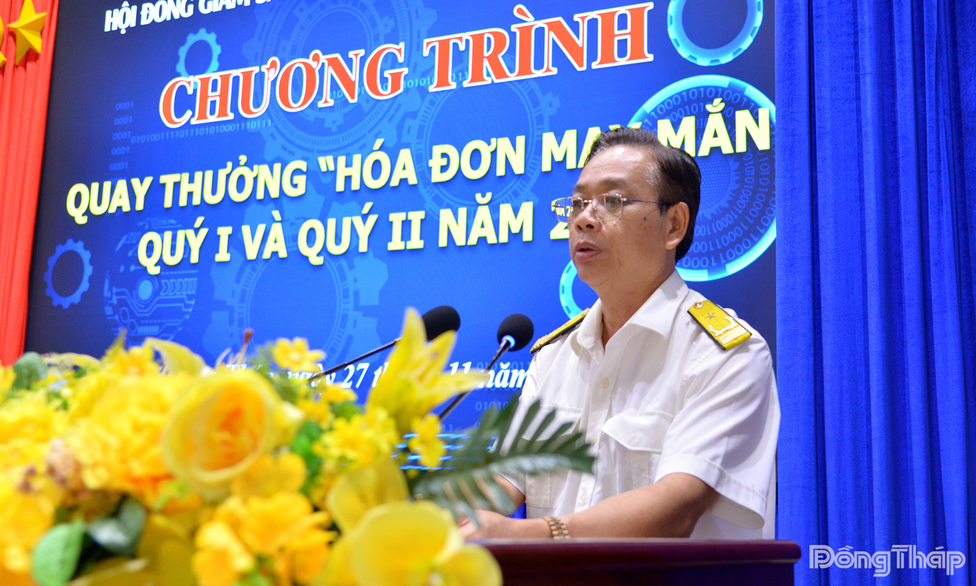 Đồng chí Đoàn Hữu Hiếu, Phó Trưởng Thuế tỉnh Đồng Tháp phát biểu tại buổi quay thưởng.