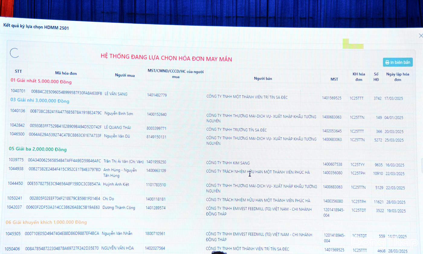 Kết quả kỳ quay thưởng quý I và quý II của Tiền Giang cũ và Đồng Tháp cũ tìm ra 60 mã số hóa đơn may mắn là người tiêu dùng cá nhân, hộ kinh doanh, với tổng trị giá giải thưởng 120 triệu đồng. Cụ thể, cơ cấu giải thưởng mỗi quý ở mỗi địa bàn được trao cho 15 mã số hóa đơn may mắn gồm: 1 giải Nhất trị giá 5 triệu đồng, 3 giải Nhì (mỗi giải 3 triệu đồng), 5 giải Ba (mỗi giải 2 triệu đồng) và 6 giải Khuyến khích (mỗi giải 1 triệu đồng).