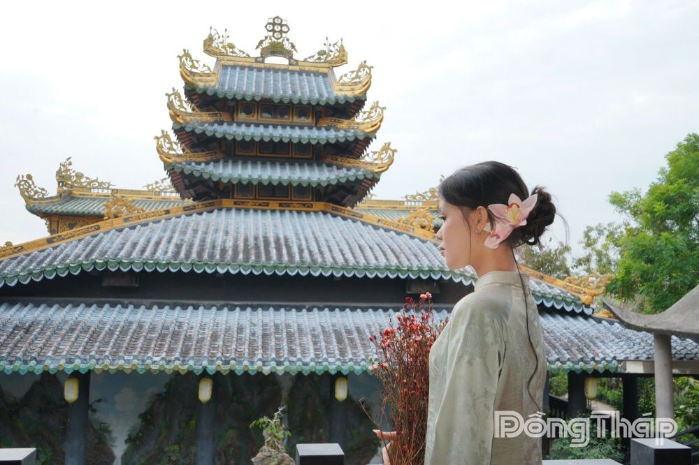 Du khách chụp ảnh tại chùa Sắc Tứ Long Hội, xã Hưng Thạnh.