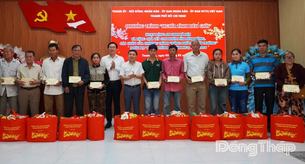Đồng chí Lê Quốc Phong, Phó Bí thư Thường trực Thành ủy TP. Hồ Chí Minh cùng đồng chí Phan Văn Thắng, Phó Bí thư Thường trực Tỉnh ủy, Chủ tịch Ủy ban Mặt trận Tổ quốc Việt Nam tỉnh Đồng Tháp tặng quà cho các hộ dân có hoàn cảnh khó khăn.