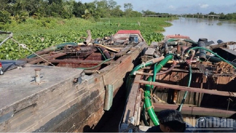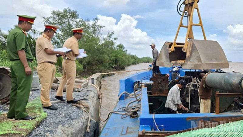 Trước đó, vào khuya 15/8, trên tuyến sông Tiền thuộc thủy phận xã Bình Ninh, tỉnh Đồng Tháp, qua công tác nắm tình hình, Phòng Cảnh sát kinh tế, Công an tỉnh Đồng Tháp cũng bắt quả tang 1 phương tiện thủy vỏ gỗ không biển đăng ký do Nguyễn Thành Đồng, sinh năm 1983, ngụ xã Long Định điều khiển, đang thực hiện hành vi khai thác cát trái phép. Tại hiện trường, lực lượng công an xác định khối lượng cát trên phương tiện là 7,488m3, cùng các tang vật khác là thiết bị bơm, hút cát.