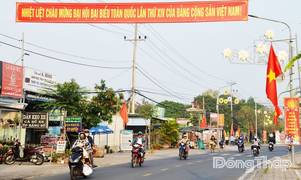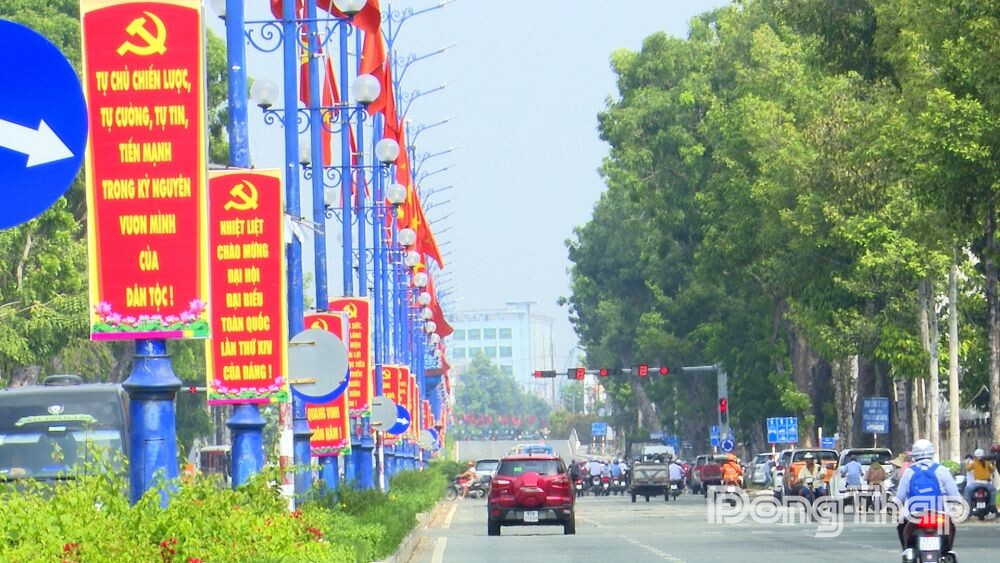 Cờ Đảng, cờ Tổ quốc và khẩu hiệu chào mừng Đại hội đại biểu toàn quốc lần thứ XIV của Đảng trên các tuyến đường lớn trên địa bàn tỉnh Đồng Tháp.