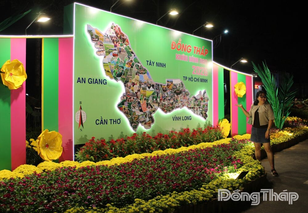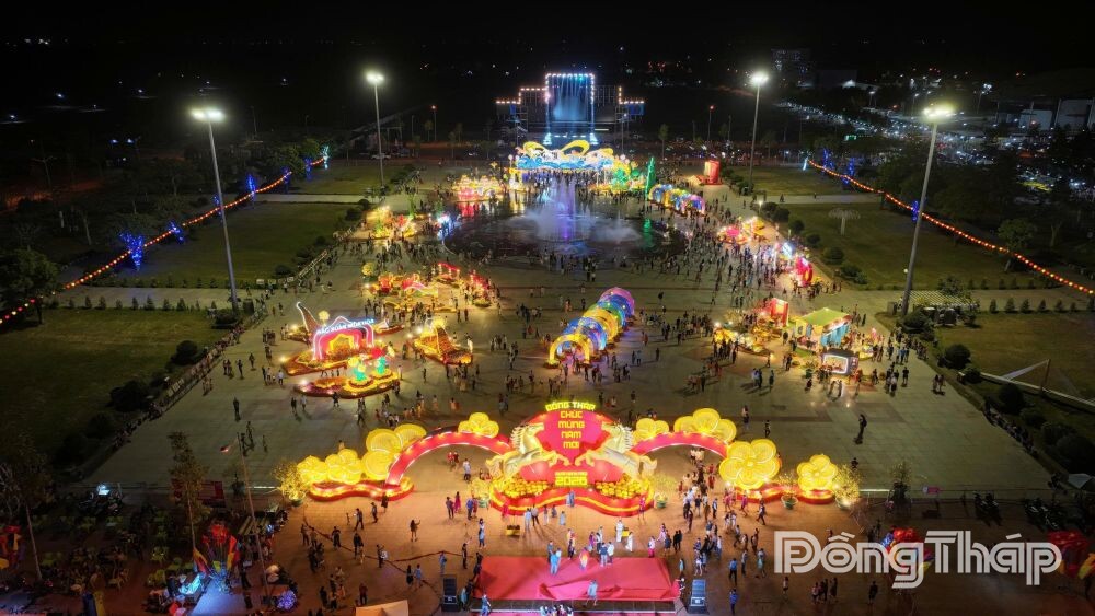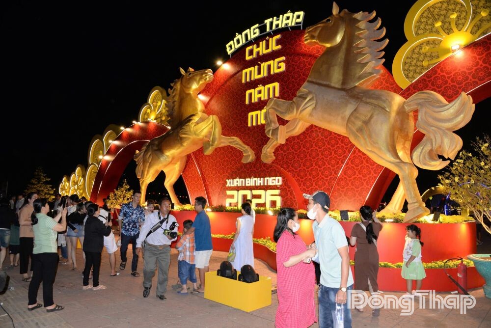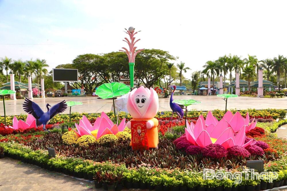 Đường hoa xuân Bính Ngọ 2026 tại Quảng trường Hùng Vương (phường Đạo Thạnh) gồm nhiều đại cảnh, tiểu cảnh được lấy cảm hứng từ vẻ đẹp tự nhiên và những giá trị văn hóa đặc trưng của tỉnh Đồng Tháp. Ảnh: TRẦN LIÊM
