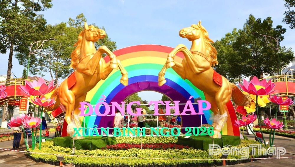 Đường hoa xuân Bính Ngọ 2026 tại phường Cao Lãnh được thiết kế trên đường Lý Thường Kiệt, gồm nhiều đại cảnh, tiểu cảnh như: Song mã khai xuân, thác lộc viên mãn, hoa đăng phú quý, bình minh thịnh vượng, mùa xuân miền sông nước…