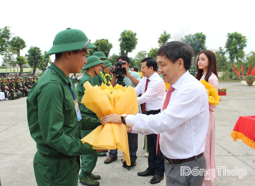 Đồng chí Phan Văn Thắng, Phó Bí thư Thường trực Tỉnh ủy, Chủ tịch Ủy ban Mặt trận Tổ quốc Việt Nam tỉnh Đồng Tháp tặng hoa chúc mừng thanh niên Đồng Tháp hăng hái lên đường bảo vệ Tổ quốc.