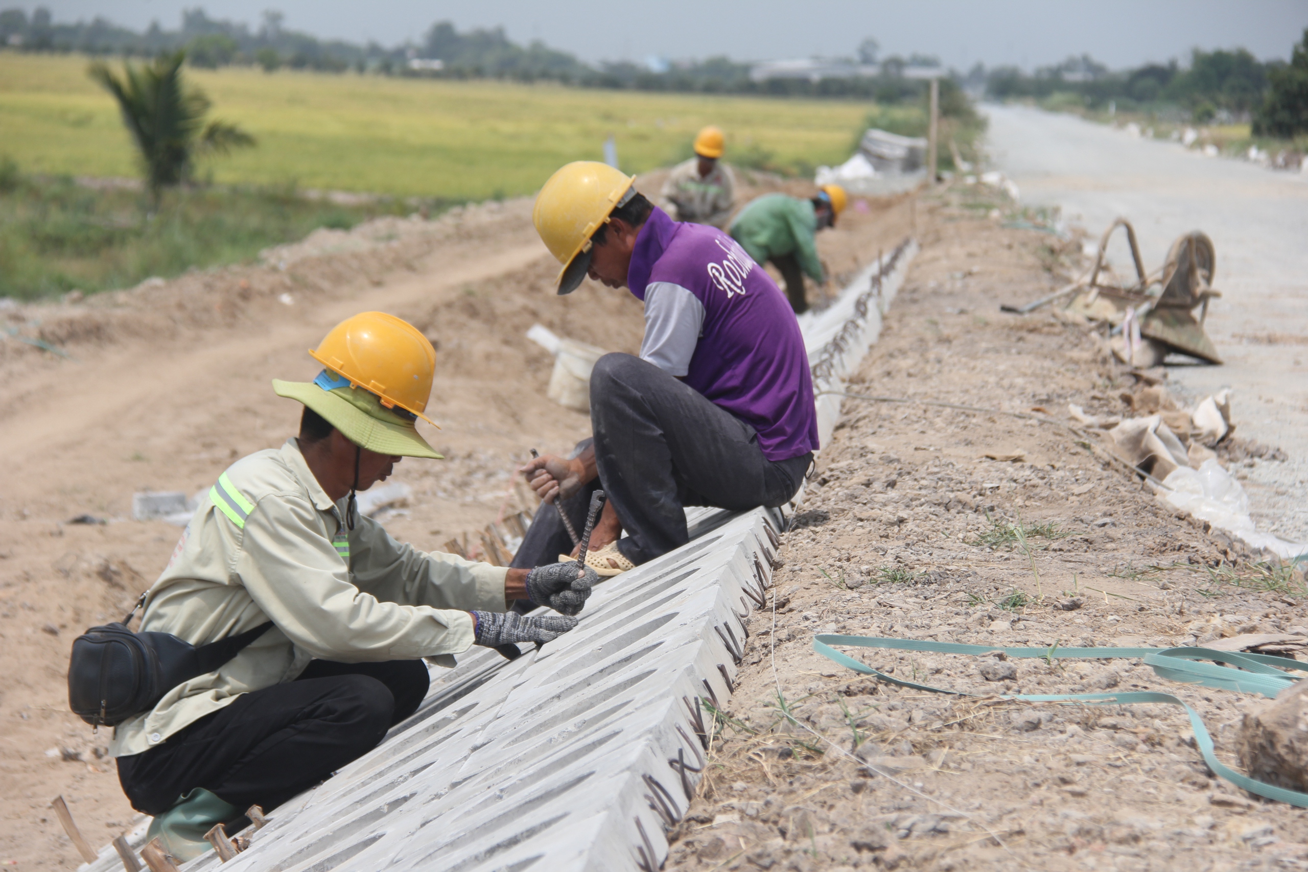 Công nhân gia cố bờ ta luy.