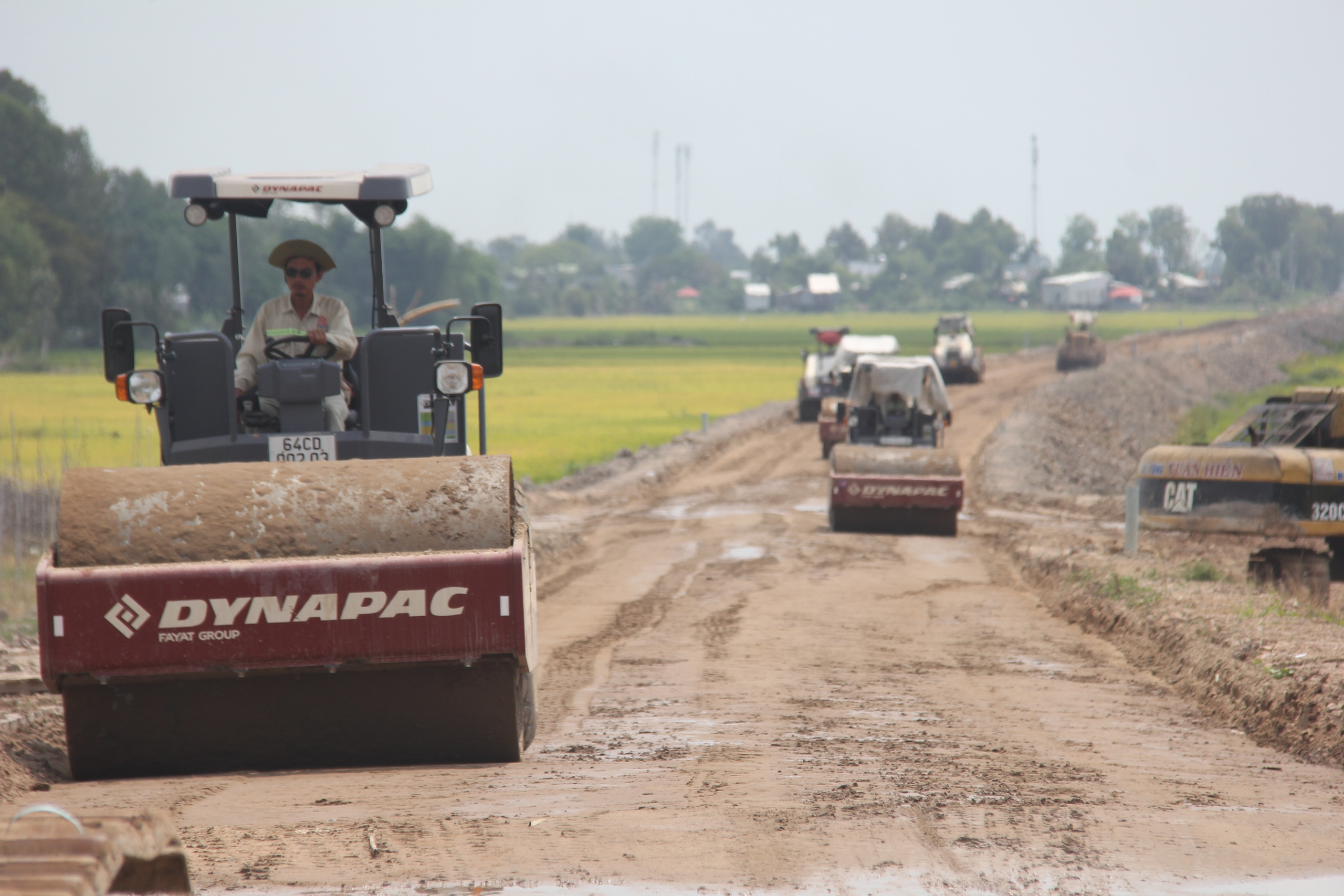 Các nhà thầu đang tăng tốc thi công hoàn thiện nền đường, xe lu, xe chở vật liệu hoạt động nhộn nhịp.