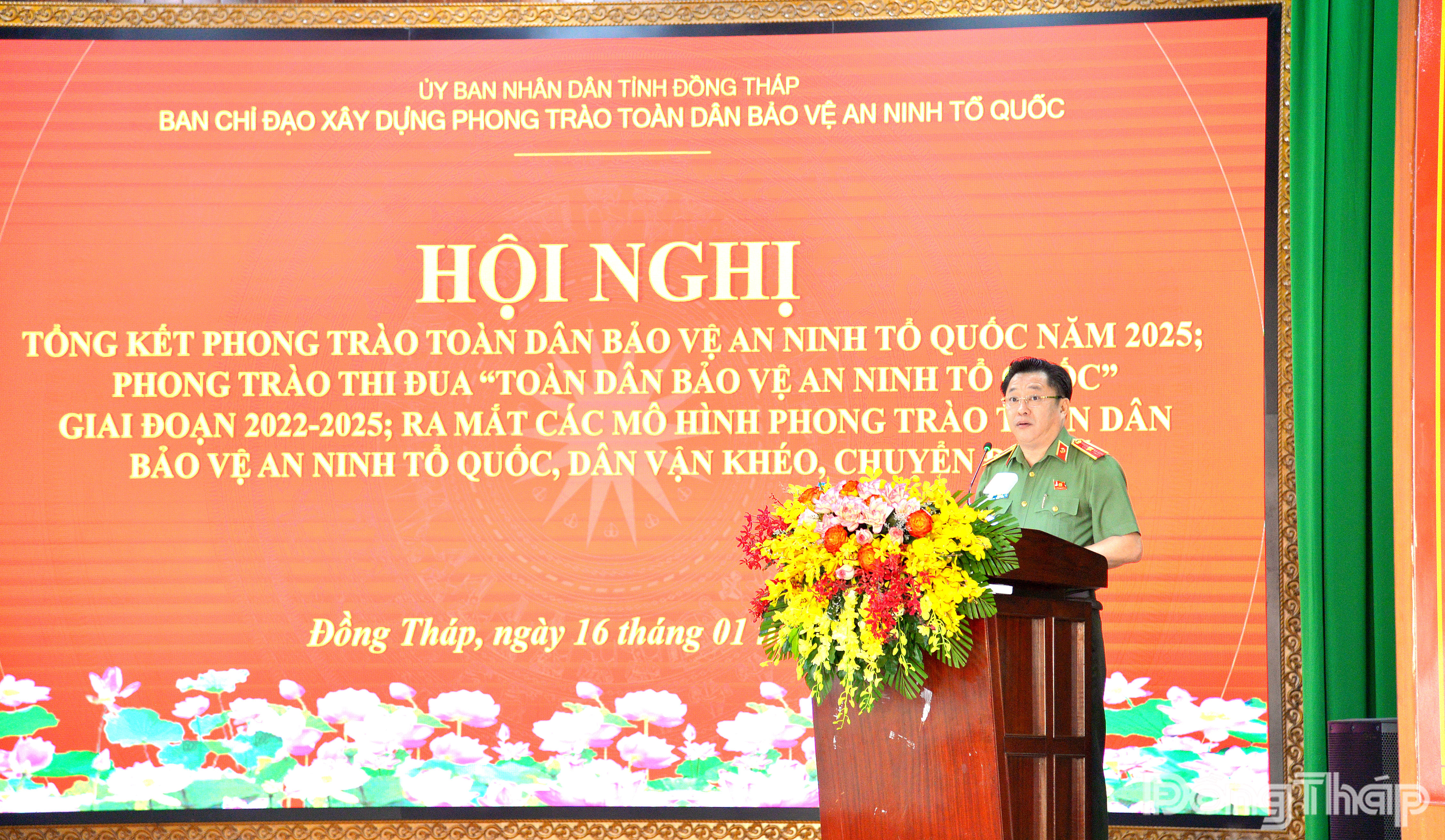 Thiếu tướng Lâm Phước Nguyên, Ủy viên Ban Thường vụ Tỉnh ủy, Giám đốc Công an tỉnh Đồng Tháp phát biểu tại hội nghị.