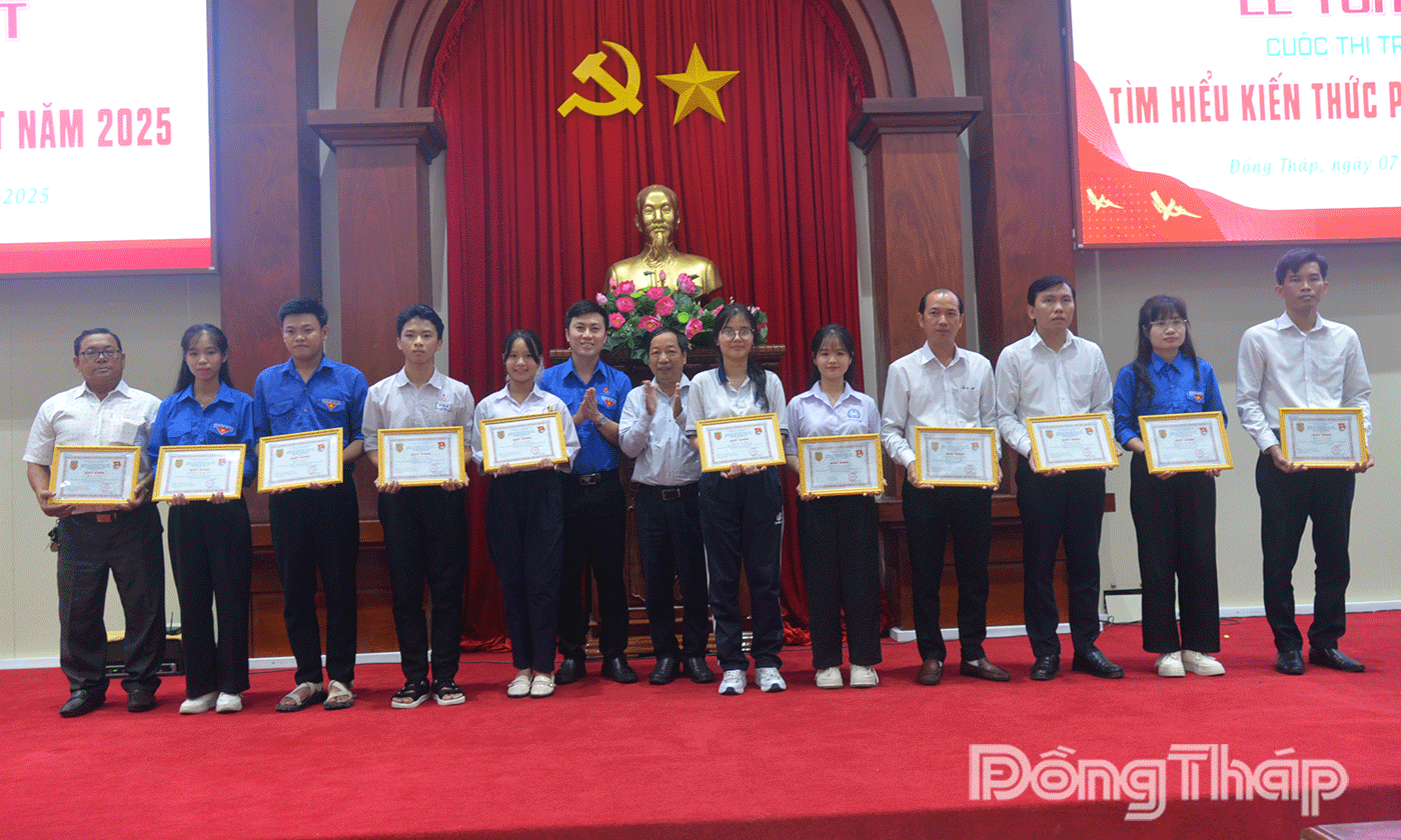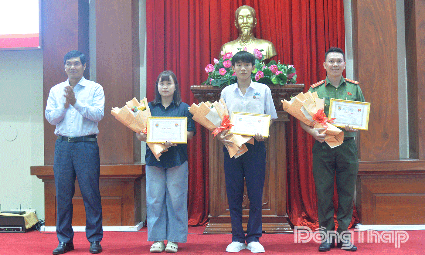 Đồng chí Huỳnh Văn Nờ, Phó Giám đốc Sở Tư pháp và đại diện Tỉnh đoàn trao giải Khuyến khích cho các thí sinh.