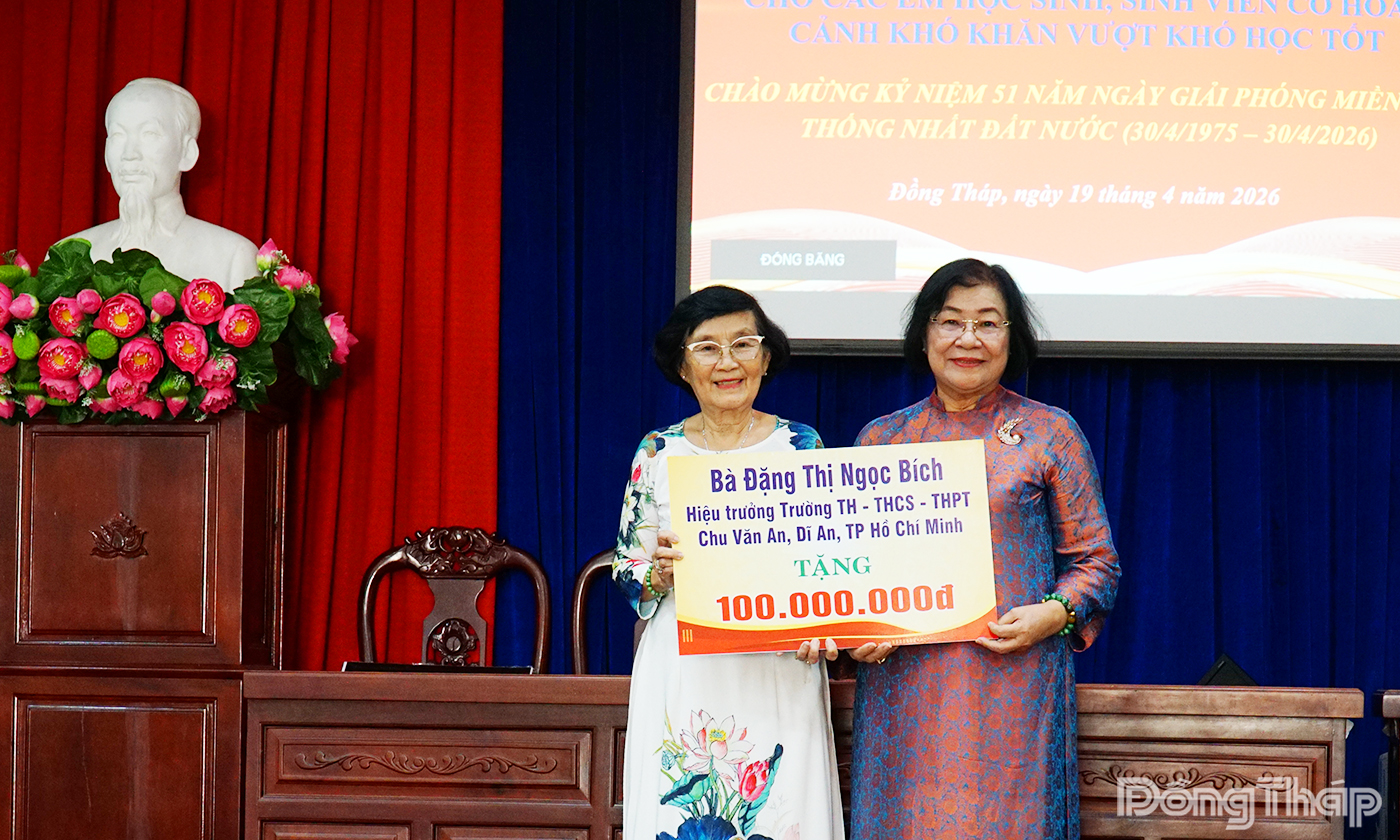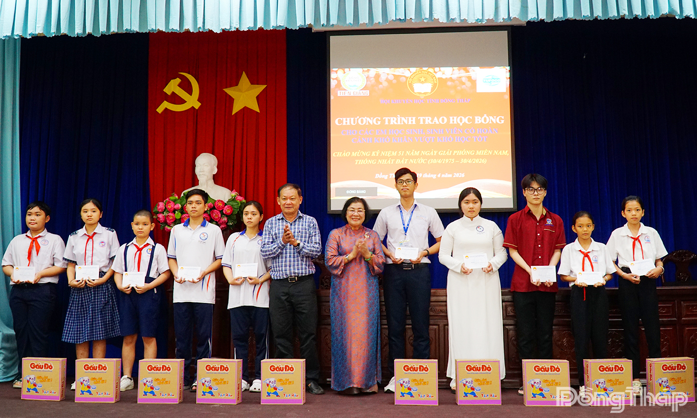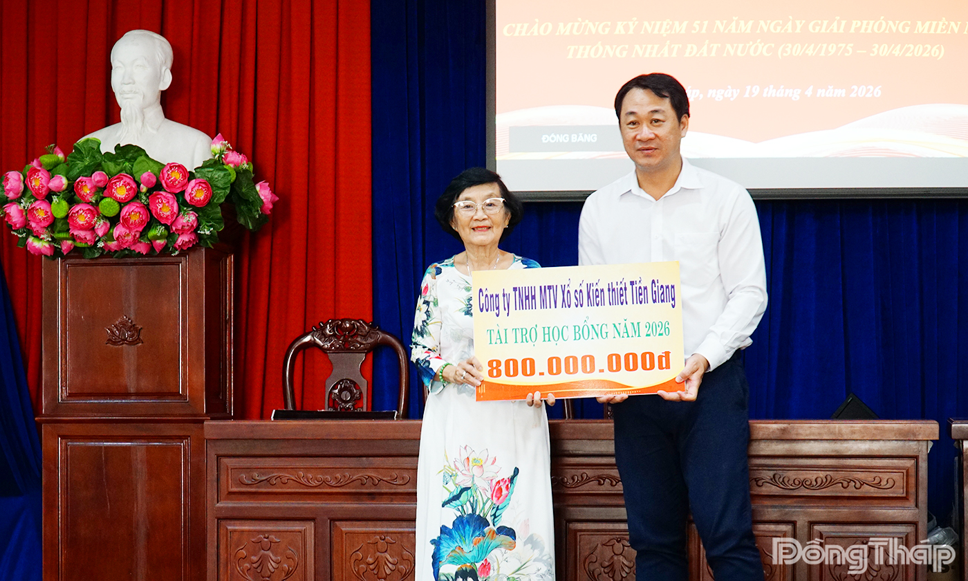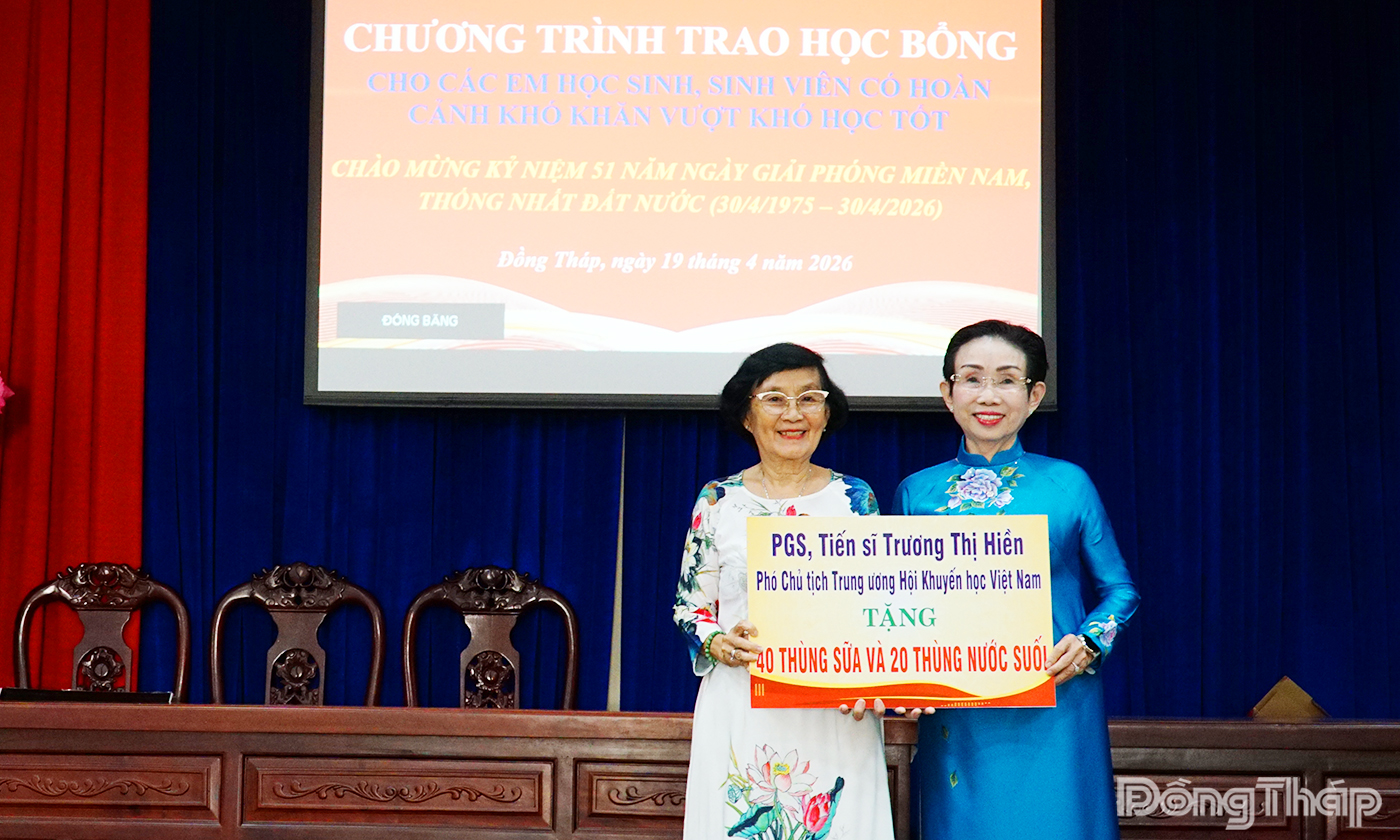 Tại chương trình, Hội Khuyến học tỉnh Đồng Tháp tiếp nhận nhiều nguồn tài trợ với tổng kinh phí hàng trăm triệu đồng. Trong đó, Công ty TNHH MTV Xổ số kiến thiết Tiền Giang hỗ trợ 800 triệu đồng cho chương trình học bổng năm 2026; Trường Tiểu học, THCS, THPT Phan Chu Trinh (TP. Hồ Chí Minh) hỗ trợ 100 triệu đồng; cùng nhiều phần quà thiết thực như sữa, nước suối, mì gói do các mạnh thường quân đóng góp.