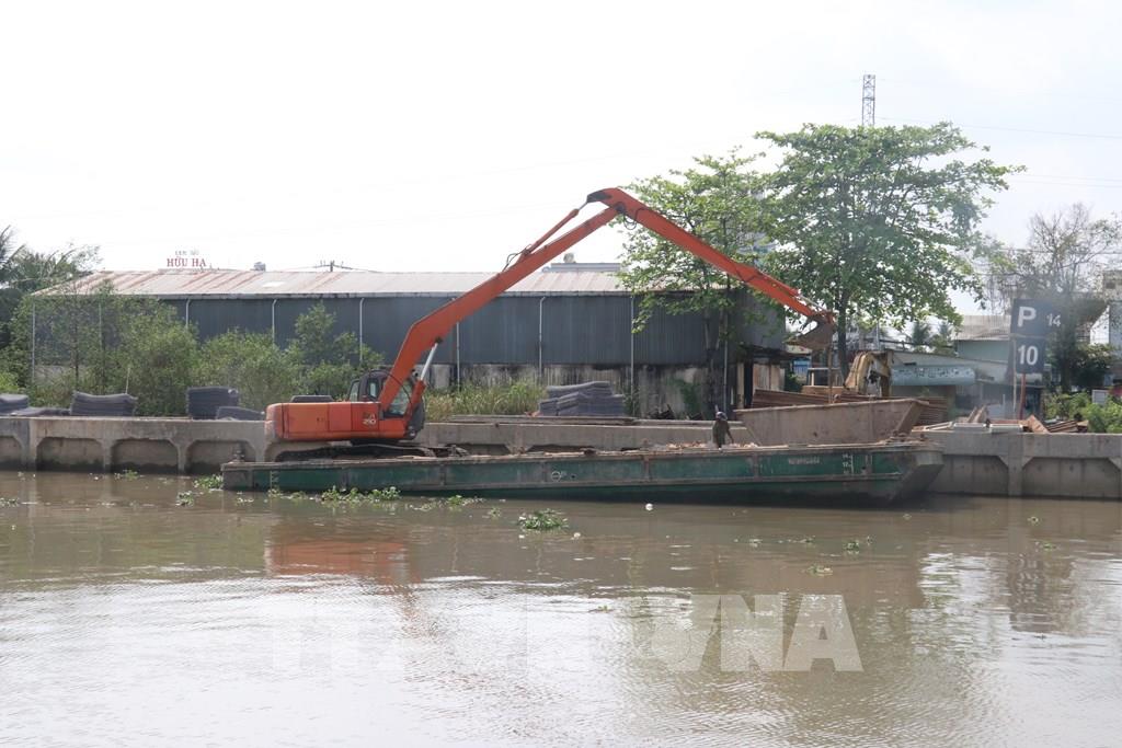 Thi công Dự án Đường giao thông hai bên bờ sông Bảo Định với tổng vốn gần 2.000 tỷ đồng. Ảnh: Công Trí - TTXVN