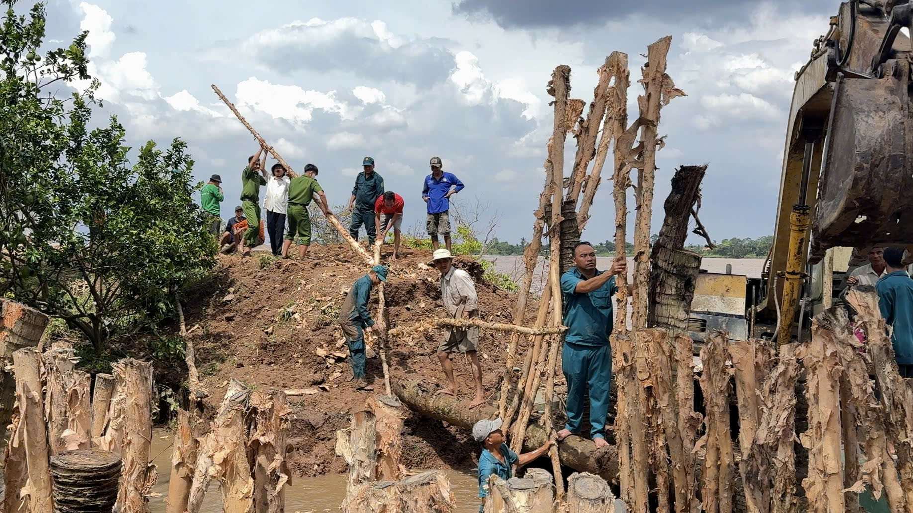 Trước diễn biến sạt lở nghiêm trọng, địa phương đã khẩn trương khắc phục, gia cố tạm các điểm xung yếu bằng bao tro, tấn mũ, thuê phương tiện cơ giới để bảo vệ khu dân cư.